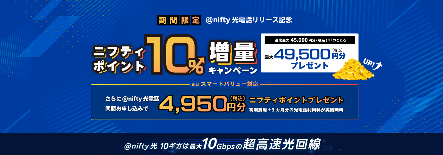 ニフティ、「@nifty光 10ギガ」対応「@nifty光電話」提供開始記念キャンペーンを実施~最大54,450円分のニフティポイントをプレゼント~