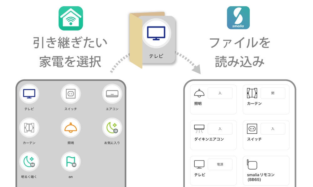 引き継ぎ機能をご利用いただくためには、最新版の「smaliaスマートリモコンアプリ」と「スマート家電コントローラアプリ」が必要です。