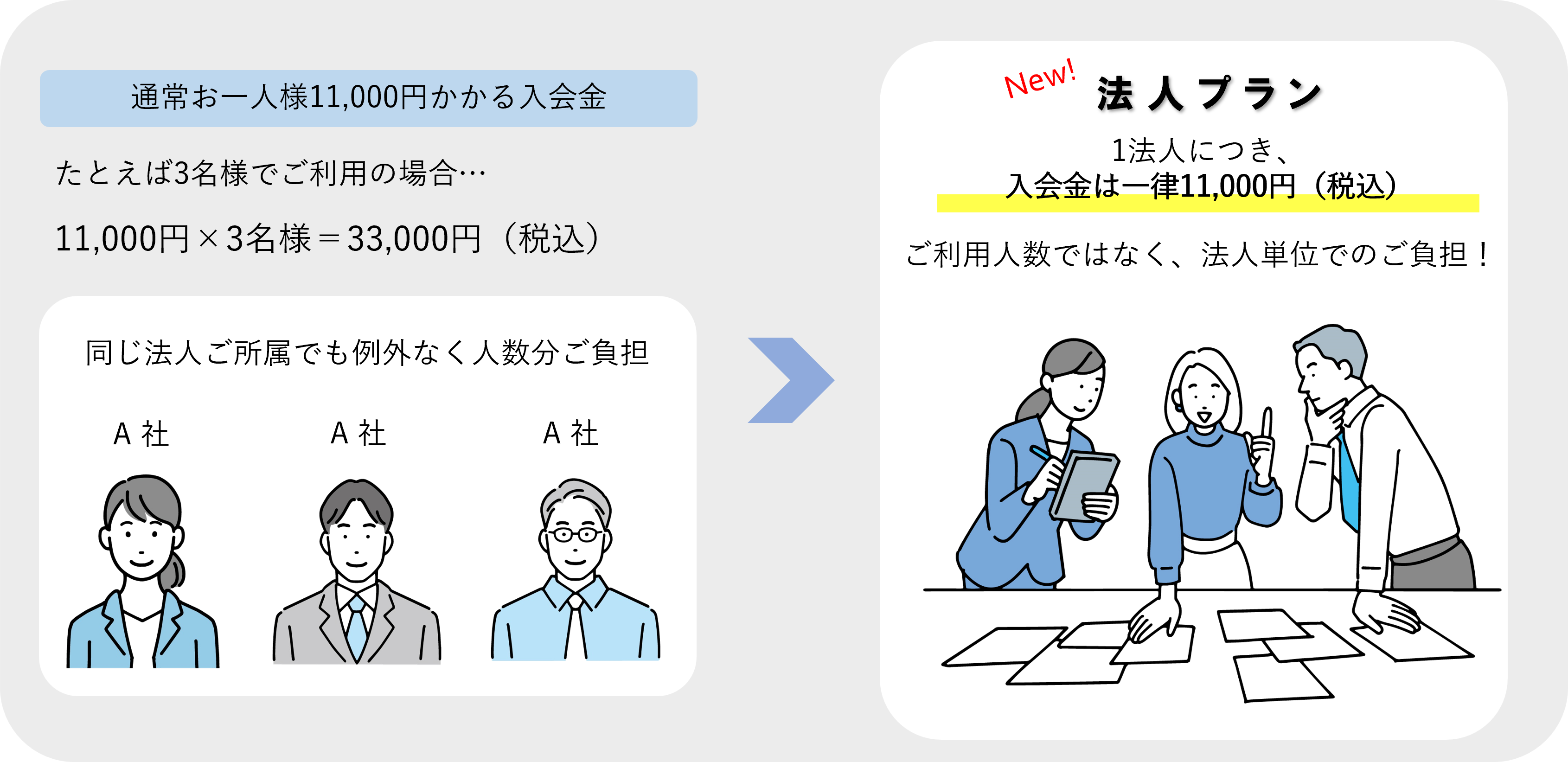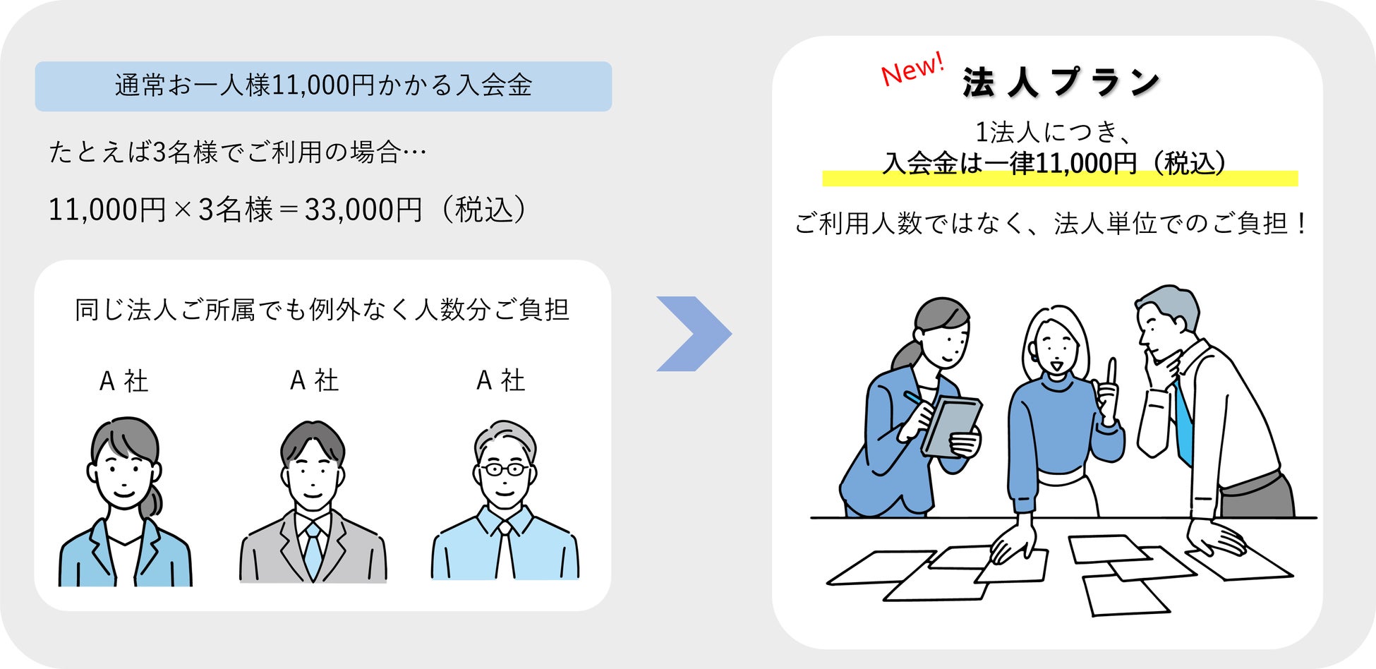通常お一人様11,000円かかる入会金が、1法人につき一律11,000円のみ。
