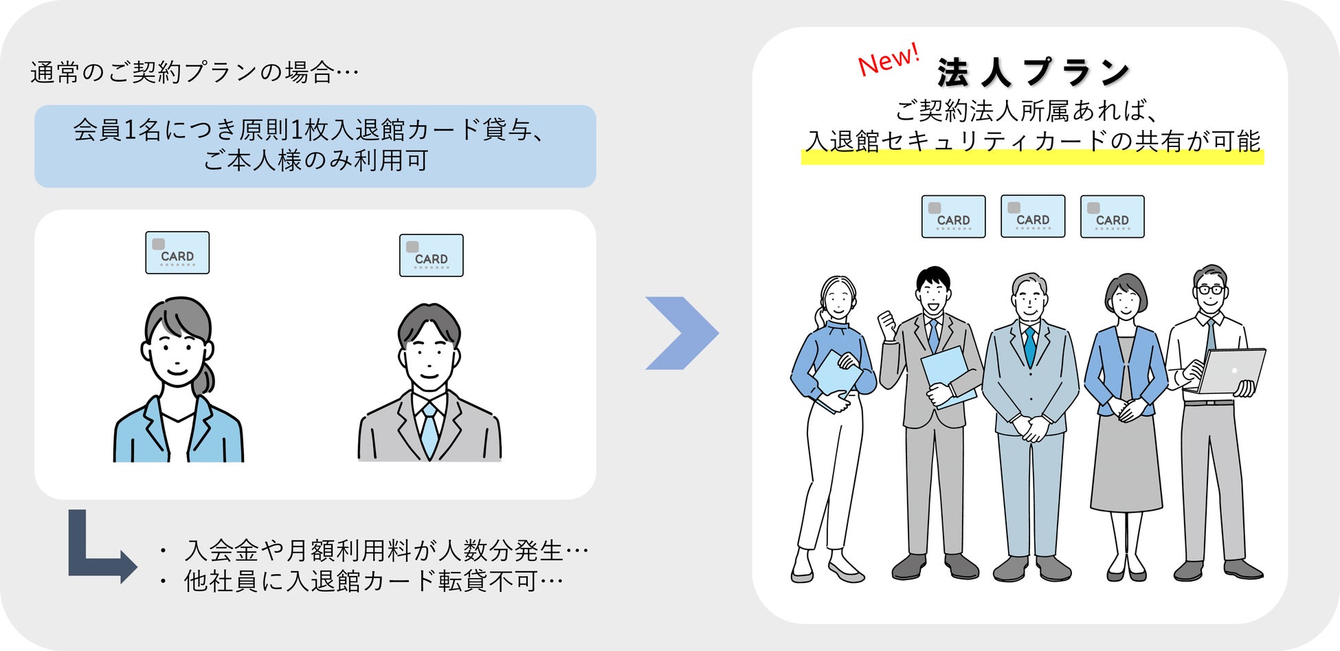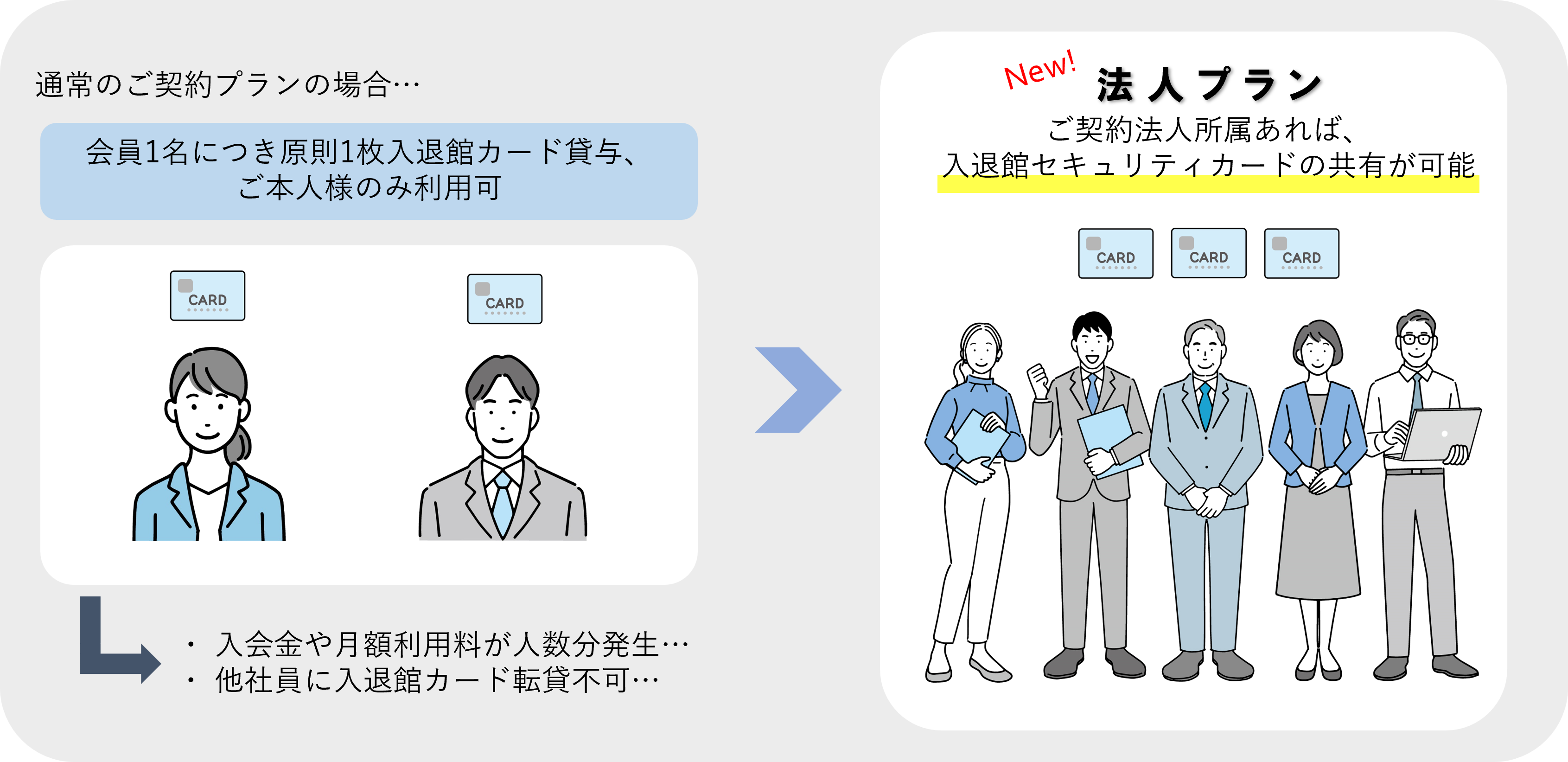 ご契約が法人名義であれば、入退館セキュリティカードの共有が可能になり、