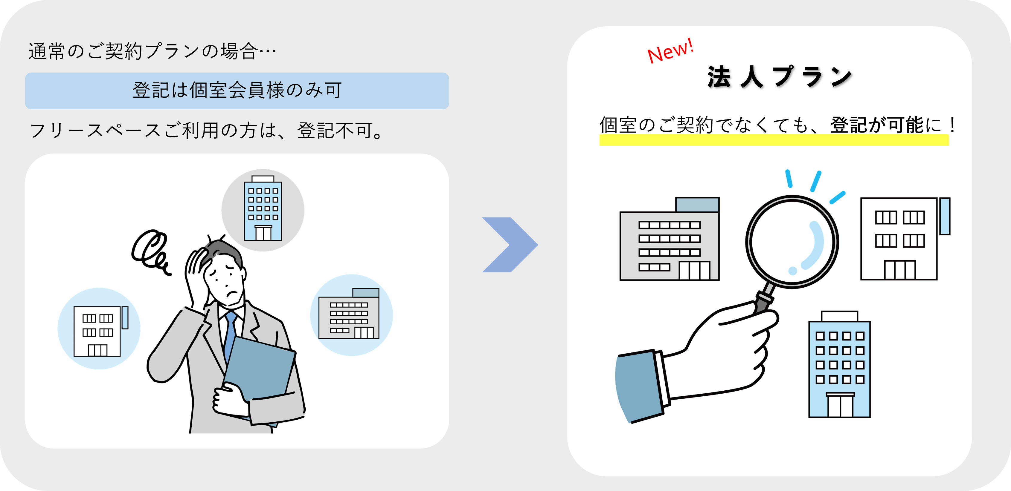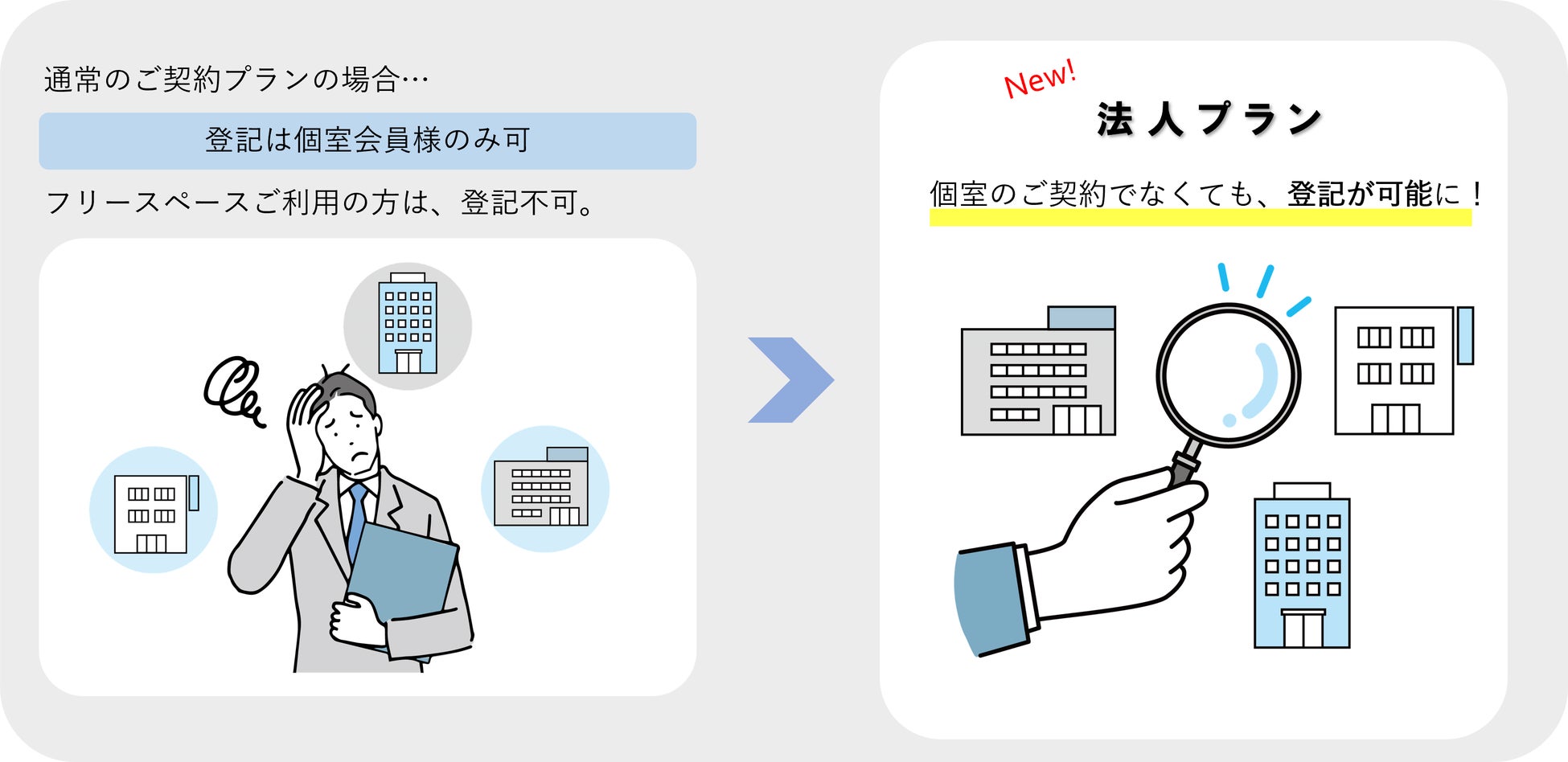 法人プランにご加入いただくと、個室のご契約でなくても登記が可能となります。