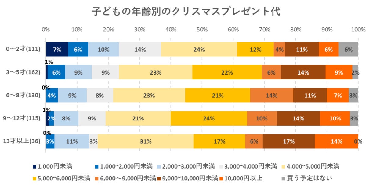 子どもの年齢によって、クリスマスプレゼントの購入金額に差があるかを見たところ、年齢が高くなるにつれて金額も高くなる傾向が見られます。例えば、0~2才の子どもがいる家庭では、プレゼント費用 が 2,000 円未満という回答は 13%ですが、子どもの年齢があがるにつれて割合が低くなり、13才以上の子どもがいる家庭では 3%になります。反対にプレゼント金額が 9,000 円以上という回答は、0~ 2才では 17%ですが、年齢があがるにつれて徐々に増え、13才以上では 31%になります。