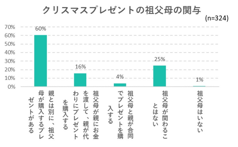 祖父母がクリスマスプレゼント購入にどのように関与しているのかも聞いてみました。圧倒的に多かったのが「親とは別に祖父母が購入するプレゼントある」(60%)でした。「祖父母が親にお金を渡して、親が代わりにプレゼントを購入する」という割合がもっと多いと予想していたのですが、多くの家庭で、費用だけでなく購入自体も、祖父母自らがしているということがわかりました。親向けにだけでなく、祖父母向けにも商品や購入先の案内があると喜ばれるかもしれません。