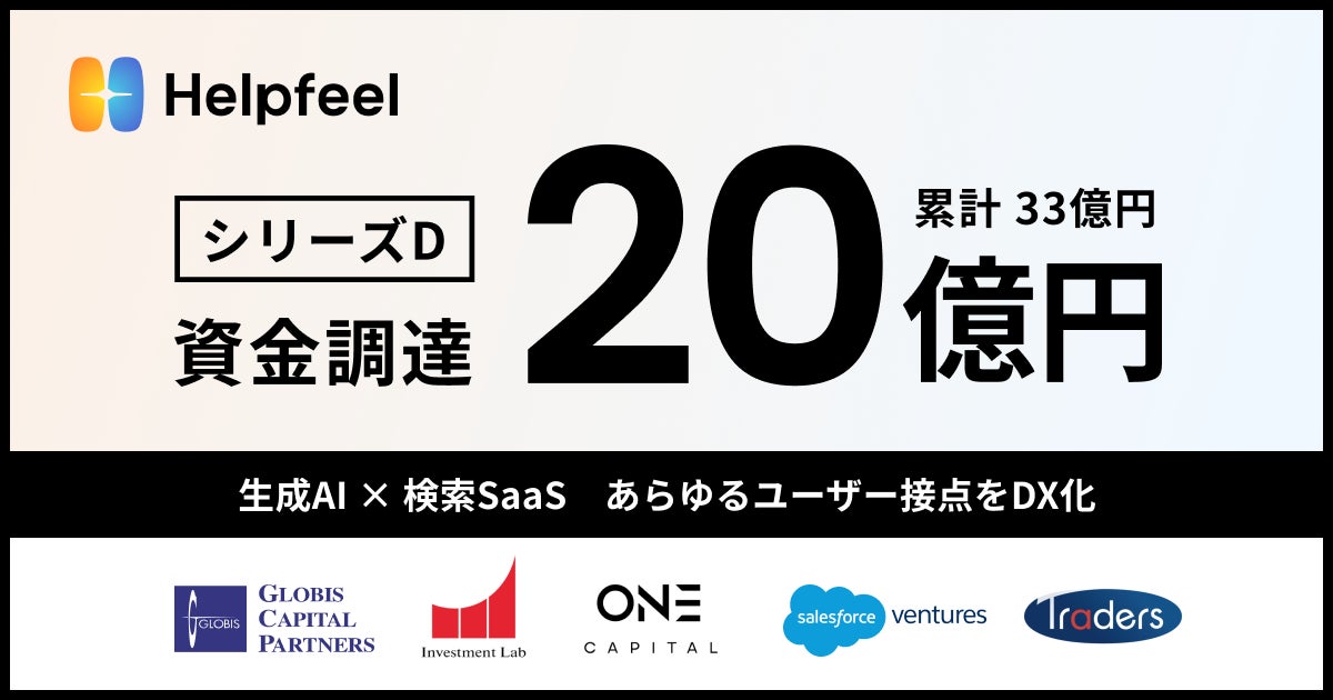 株式会社Helpfeel(京都府京都市、代表取締役/CEO:洛西一周、以下「当社」)は、検索型AI-FAQ『Helpfeel』を中心にさらなる発展を目指して、グロービス・キャピタル・パートナーズ株式会社(東京都千代田区、代表取締役:堀 義人)をリード投資家とし、シリーズDラウンドにて総額20億円を資金調達いたしました。累計調達額は約33億円になります。