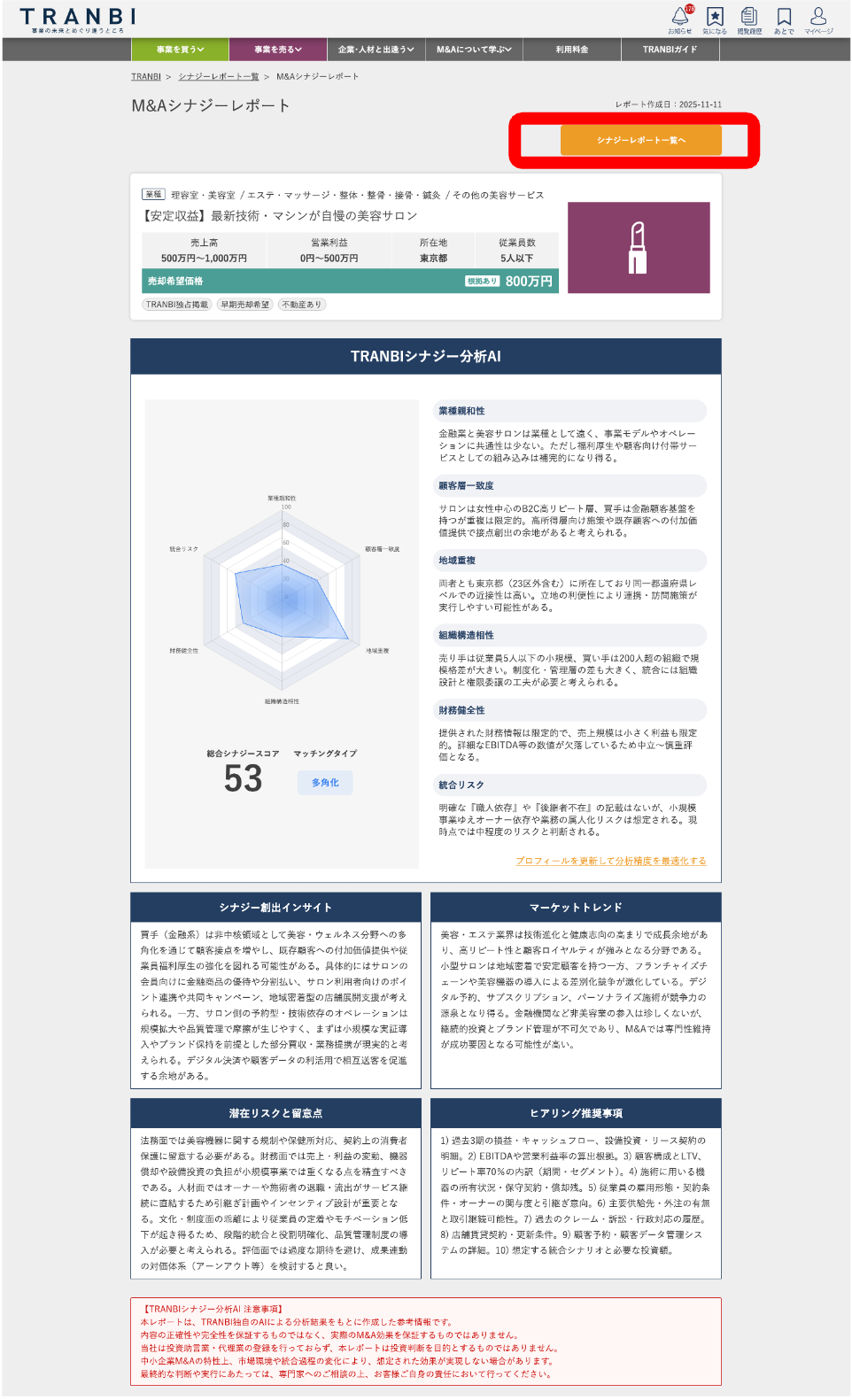 関心のある売却案件詳細画面で本機能をご利用いただくと、TRANBI独自のAIアルゴリズムが売却案件と買い手様の事業の相性(親和性)を「シナジースコア」として数値化するほか、マーケットトレンドや潜在リスク、交渉時のヒアリング推奨事項等をレポート表示します。