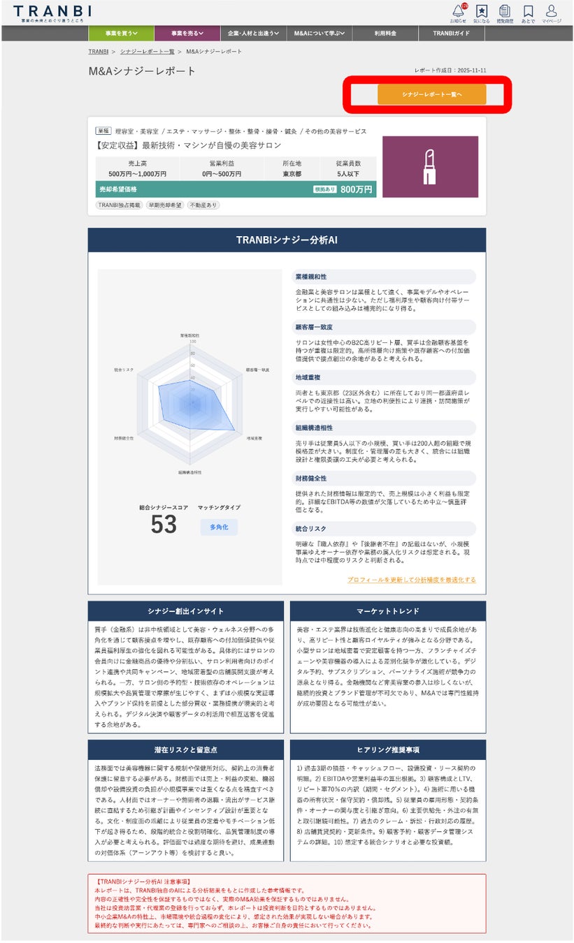 株式会社トランビ(本社:東京都港区、代表取締役CEO:高橋聡)が運営する事業承継・M&Aマッチングプラットフォーム「TRANBI」は、2025年11月13日(木)、M&A案件との相性をデータで可視化する「AIシナジー分析レポート機能」(β版)をリリースいたしました。