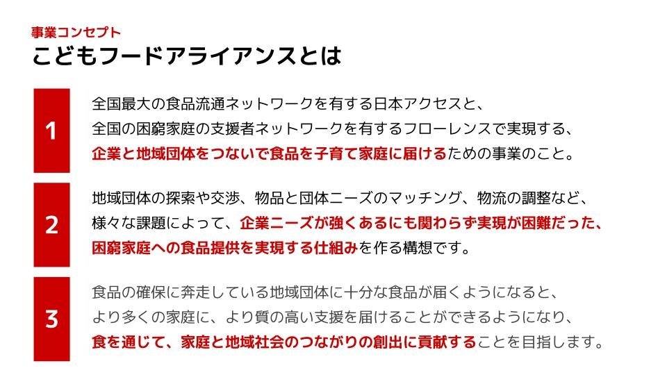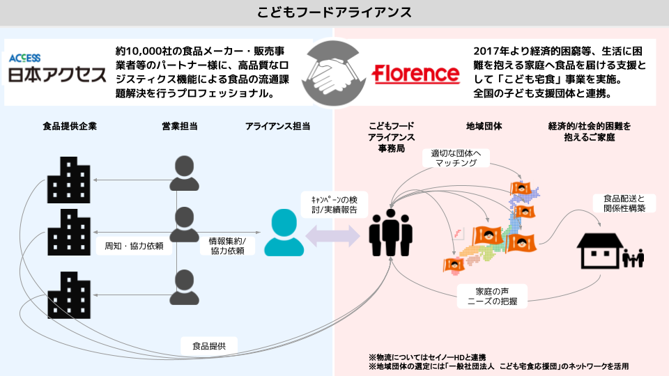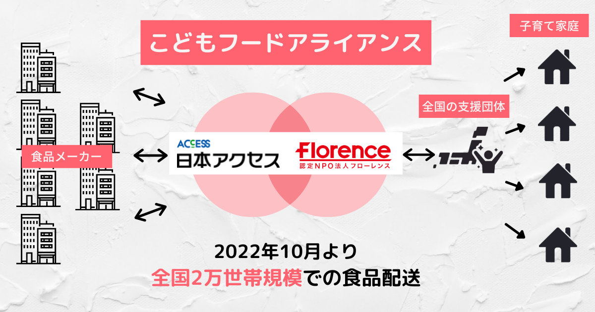 認定NPO法人フローレンス(東京都千代田区、代表理事:赤坂緑)と株式会社日本アクセス(東京都品川区、代表取締役社長:佐々木 淳一)は、大手食品メーカー各社の協賛のもと、全国のこども宅食実施団体など子育て支援団体を通じて全国の子育て家庭へ食支援を行う取り組み「こどもフードアライアンス」の第2弾を10月より実施しています。