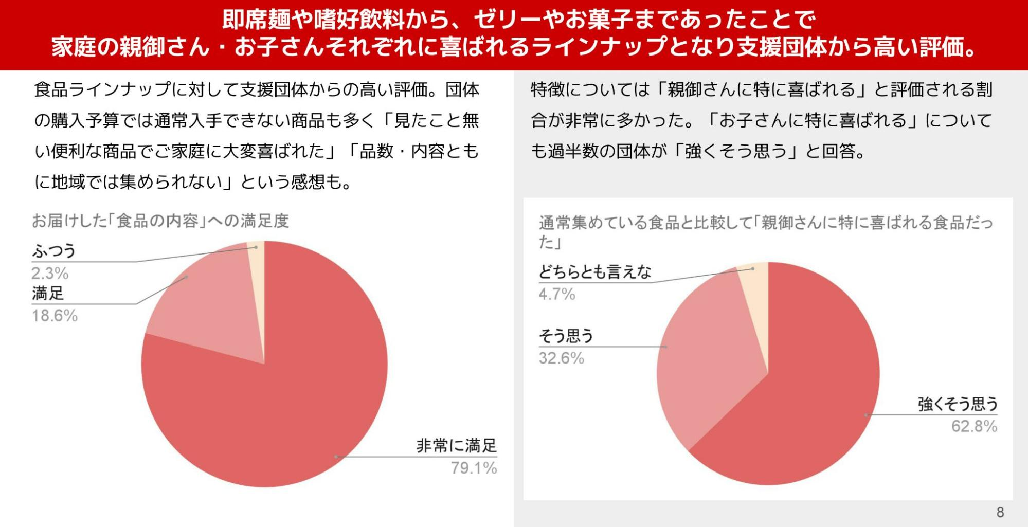 団体の購入予算では買えない食品も多かったことから、「購入したことがない商品でご家庭に大変喜ばれた」や「品数・内容ともに地域では集められない」など、「こどもフードアライアンスだからこそ実現できた内容」との評価を得ています。