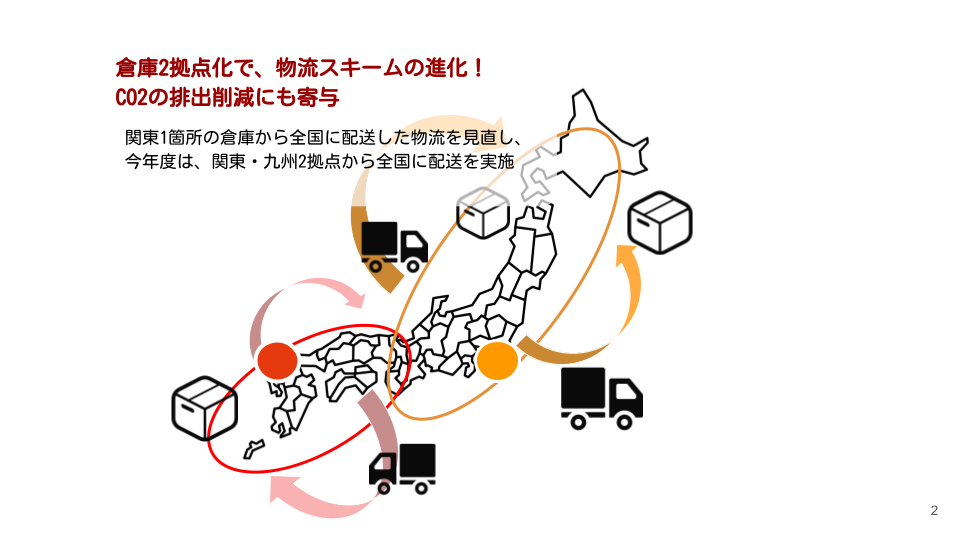 第1回トライアル配送の際は、東京1箇所の倉庫から全国に配送しましたが、支援団体が九州に多くあることも勘案し、今回は東京・佐賀2拠点から全国各地への配送と、物流の見直しも行いました。CO2の排出など物流における環境負荷低減にもつながります。