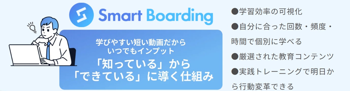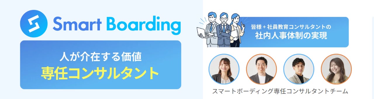 Smart Boardingを導入して終わりではなく、導入企業様の目指す企業成長、それを実現するために必要な中長期人財戦略の共創、階層や役割別に求める人材像の具体化や社員教育課題の特定、学習プログラム作りの支援までワンストップで伴走していくことが特徴です。