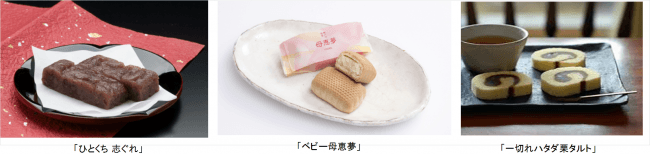 また、昼食提供便(*3)でも愛媛県の茶菓をご用意します。羽田出発便では、「母恵夢(ぽえむ)」(東温市)の「ベビー母恵夢」を提供します。卵を使った黄味餡の甘み、ほんのりとバニラが香るおまんじゅうです。口当たりまろやかな生地に、豊かに香るバターの風味が特徴です。羽田到着便では、「ハタダ」(新居浜市)の「一切れハタダ栗タルト」を提供します。伊予特産の生柚子を使った香り豊かな柚子餡と刻み栗をしっとり柔らかな生地で巻き上げた四国銘菓です。柚子香る餡と、刻み栗とが生み出すまろやかな味わいをお楽しみ下さい。