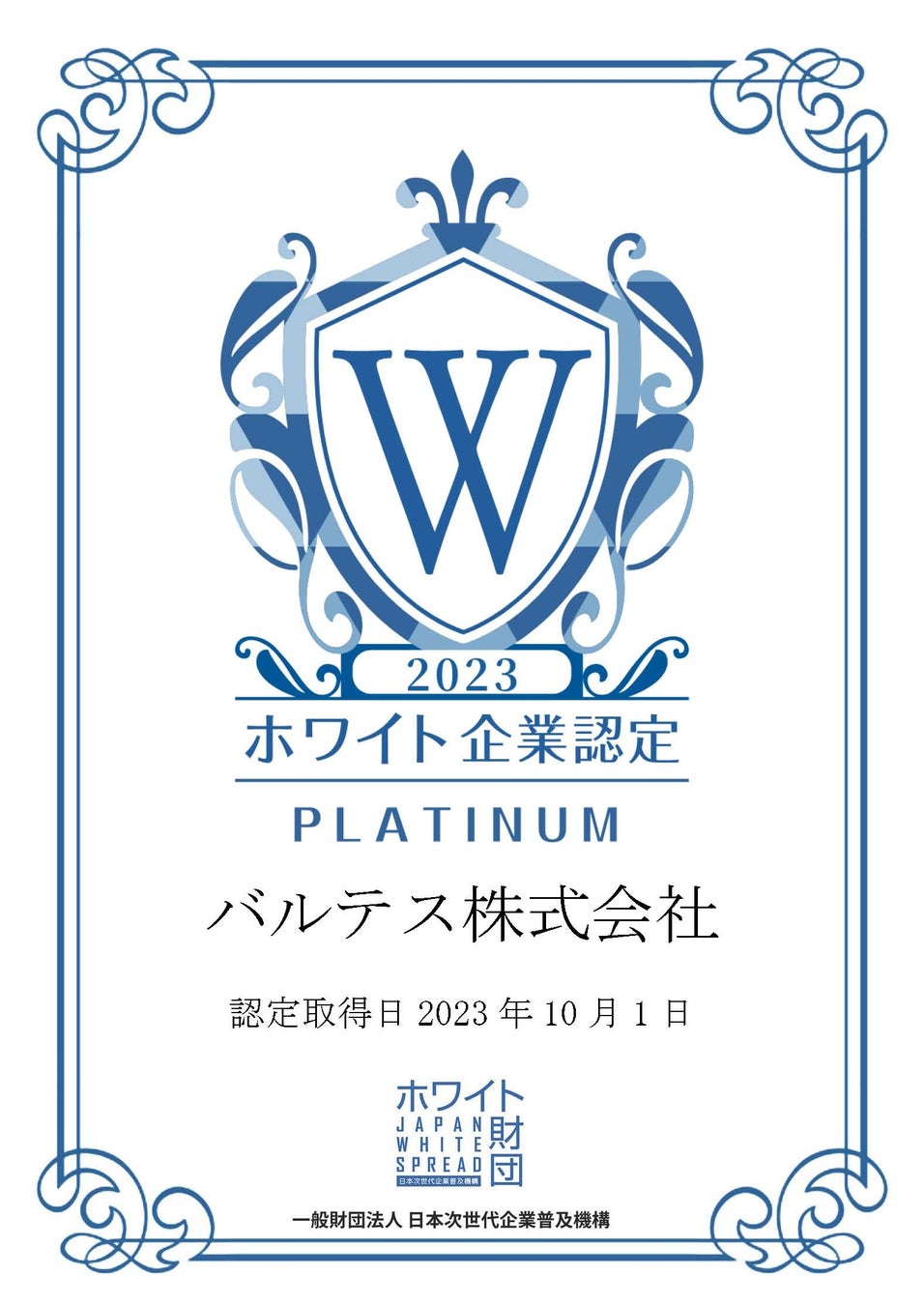 バルテス、ホワイト企業認定でプラチナへ昇格、認定基準90%以上を達成し最高位の「プラチナ」に認定