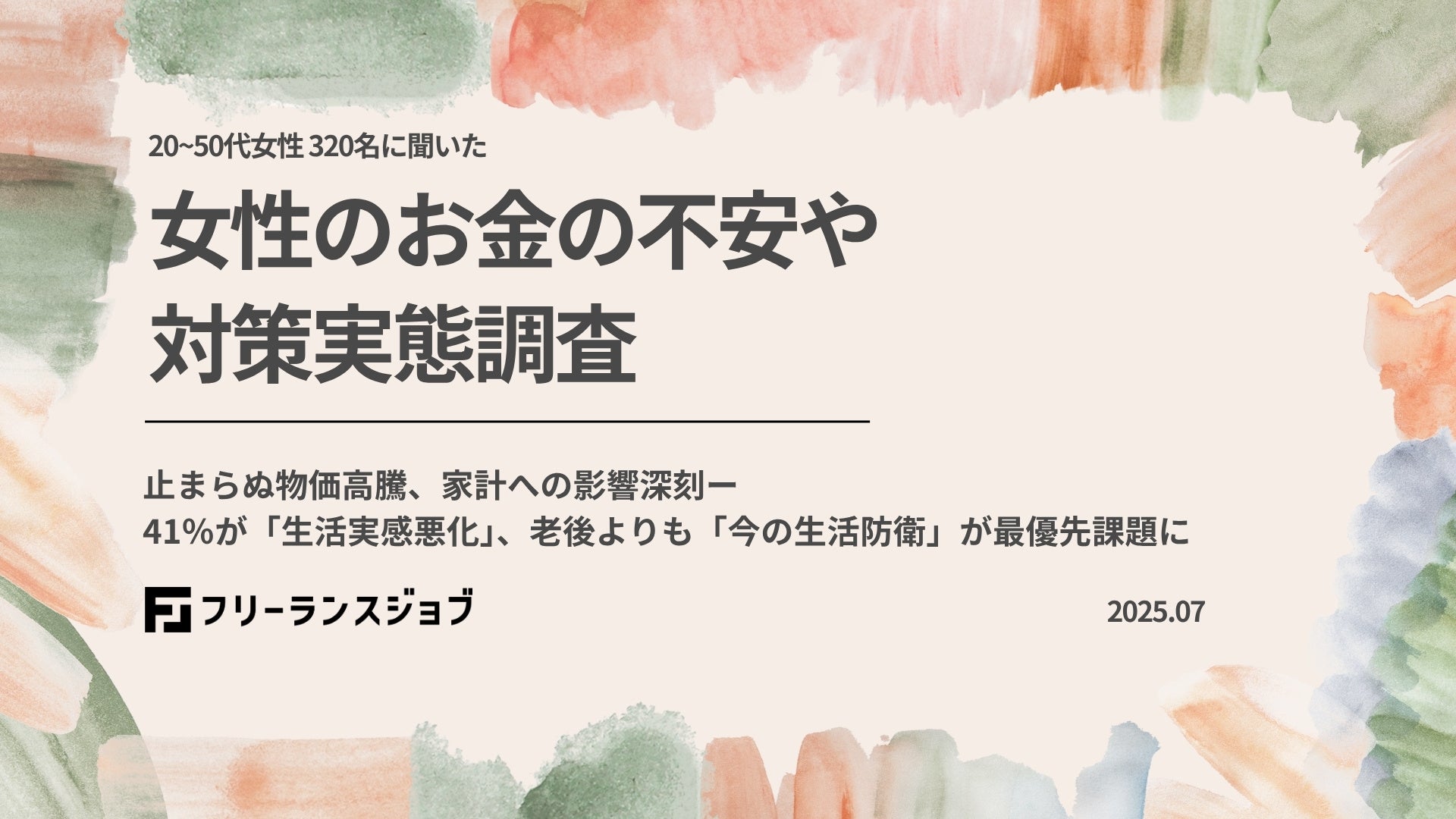 フリーランスエンジニア向けIT案件・求人検索サイトのフリーランスジョブ(https://freelance-job.com/)を運営する株式会社Hajimari(所在地:東京都渋谷区、代表取締役:木村 直人)は、20〜50代女性320名へ「お金に関する不安や対策」を聞いた調査を実施いたしました。昨年より生活実感が悪化する中で、女性のお金にまつわる実態が明らかになっています。