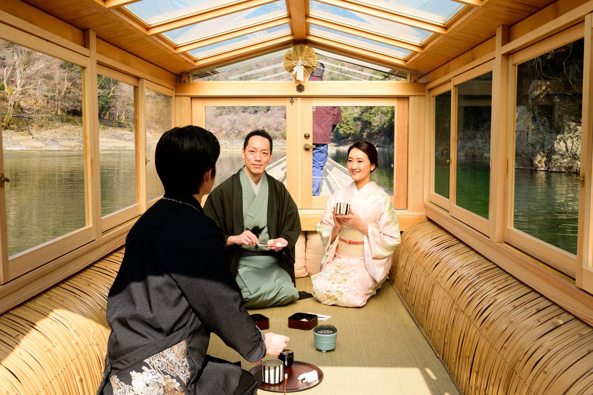 翌朝は、星のや京都の目の前を流れる大堰川で雅な屋形舟「翡翠」を貸し切り、冬の香りの練香を焚きしめながら、スタッフが点てるお茶と季節の和菓子を楽しみます。全面を窓に囲まれた屋形舟「翡翠」では、水墨画のような冬の渓谷の風景を眺めながら、静かにお茶を味わえます。かつて四季の渓谷の風景を愛でながら舟遊びに興じた平安貴族さながらの時間を楽しむひとときです。