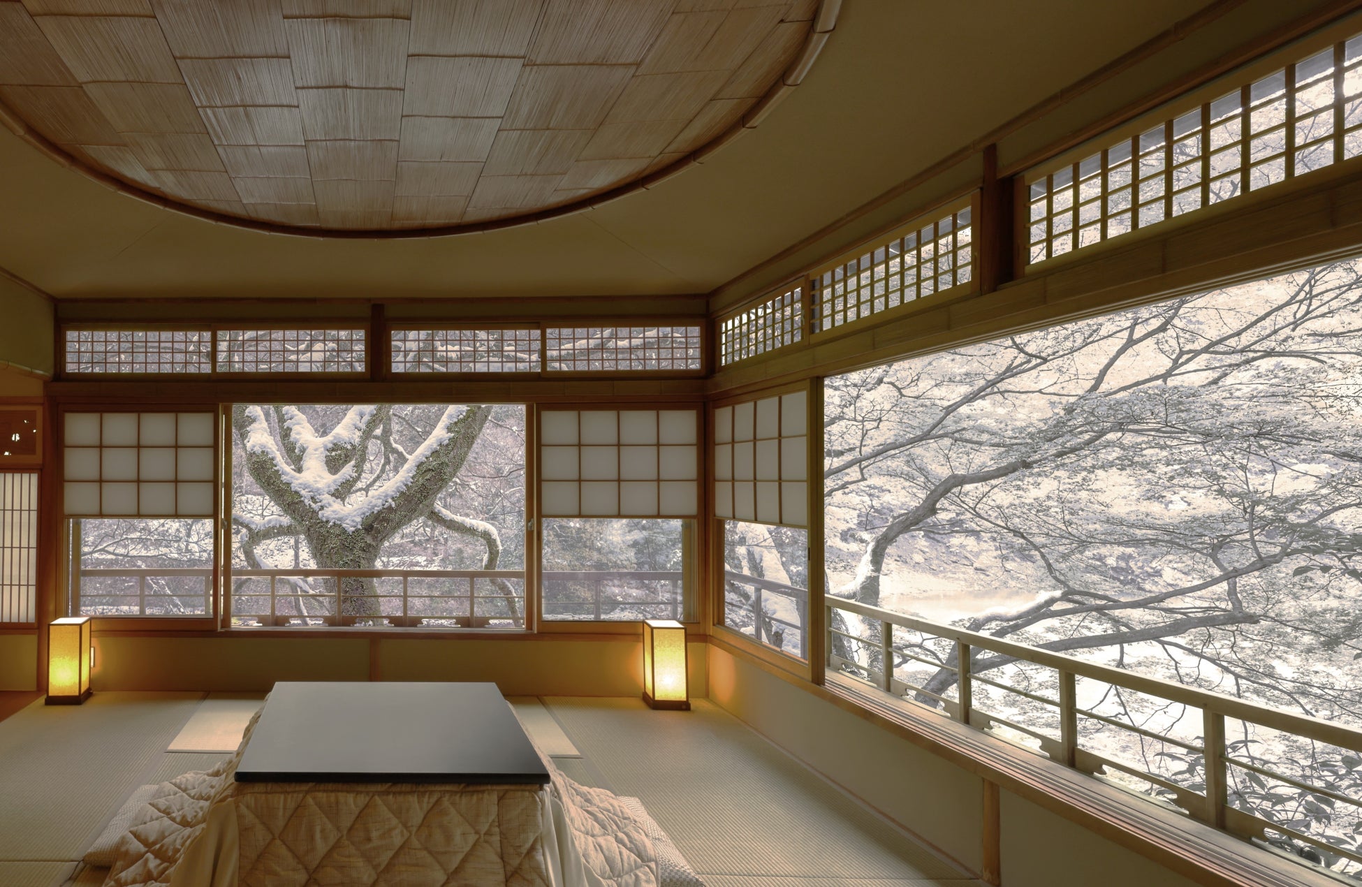 客室には、オリジナルの炬燵を設えます。炬燵布団は、平安貴族にも縁の深い襲(かさね)*4の色目の「初雪の襲」*5の色合わせを参考にして仕立てました。滞在中、炬燵を設えた客室では、冬の香りを調合する練香づくり、特別夕食や特別朝食が楽しめます。また、本プログラムは14時のレイトチェックアウトができるので、出発まで時間を気にせずに過ごせます。額縁に切り取られたような冬の小倉山や大堰川(おおいがわ)の景色を楽しみながらリラックスできる時間です。