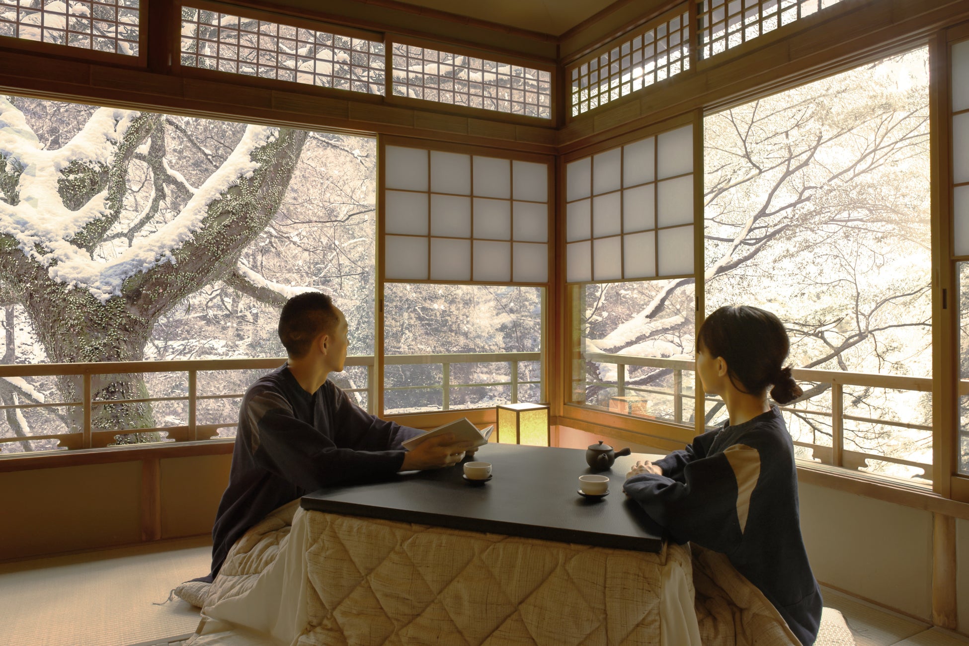 12:00 炬燵を設えた客室で思い思いの時間を過ごす