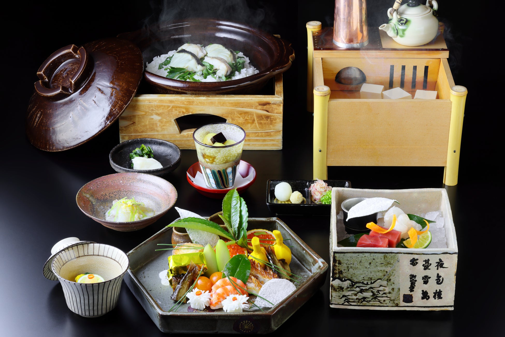 夕食は、冬の味覚を堪能する会席料理です。先付には、白子と菊菜を酢橘や紅葉卸などでさっぱりと合わせた一品や、鯛と蕪を糀(こうじ)で合わせ柚子の香りを利かせた一品を用意します。口取りには、ぐじ、車海老、ふく*6をはじめとした冬の味覚をさまざまな方法で楽しめる品々を揃えました。さらに、冬に身体を温める湯豆腐や、通称のどぐろと呼ばれる赤むつと黒むつを贅沢に使用した御飯が味わえます。冬の味覚を堪能する特別夕食を味わいながら、贅沢な時間を過ごせます。