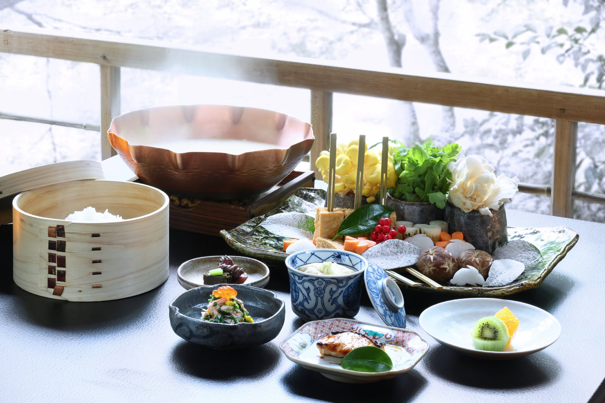 朝食は、冬の野菜と鶏つくねを白味噌仕立ての出汁で味わう特別朝食を用意します。京都の冬に欠かせない白味噌はまったりとしていて甘みがあり、冷え込む朝に身体を温めることができます。その他、蟹の白和えや温玉湯葉餡掛け、脂乗りの良い鰤の照り焼きなどを用意しました。冬の凛とした渓谷の風景を眺めながら、客室でゆったりと味わいます。