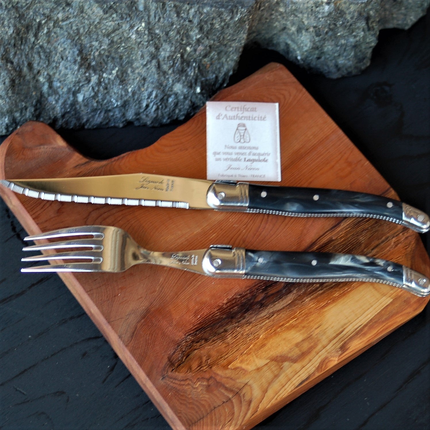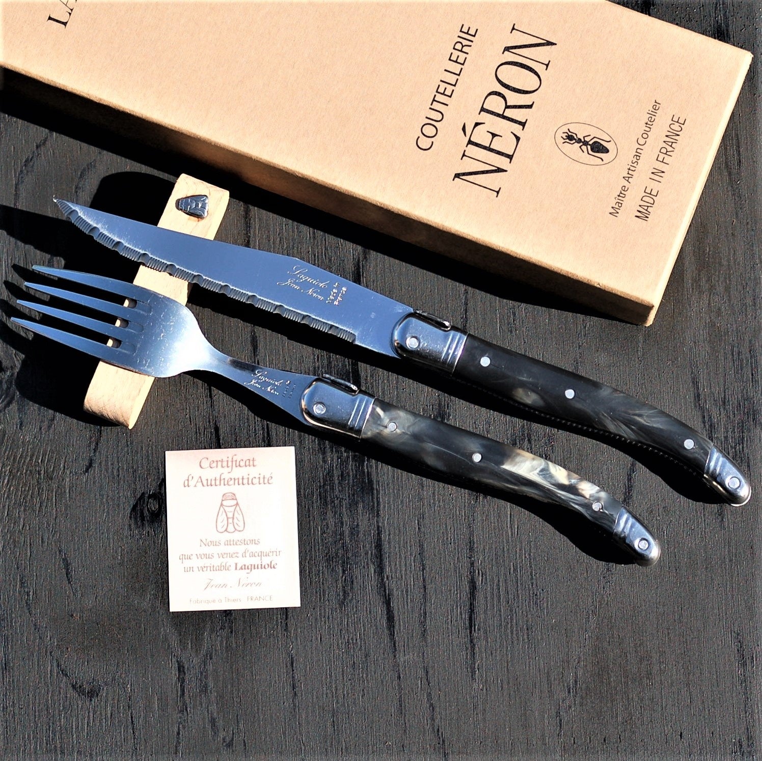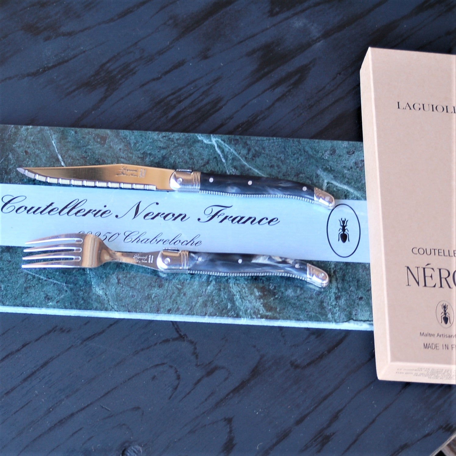 販売サイト amazon.jp ライヨール ABS ハンドル ステーキナイフ フォークセット 黒大理石風 ギフト箱入り フランス製 NERON 価格;¥10,780(税込)