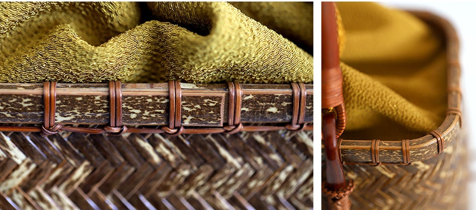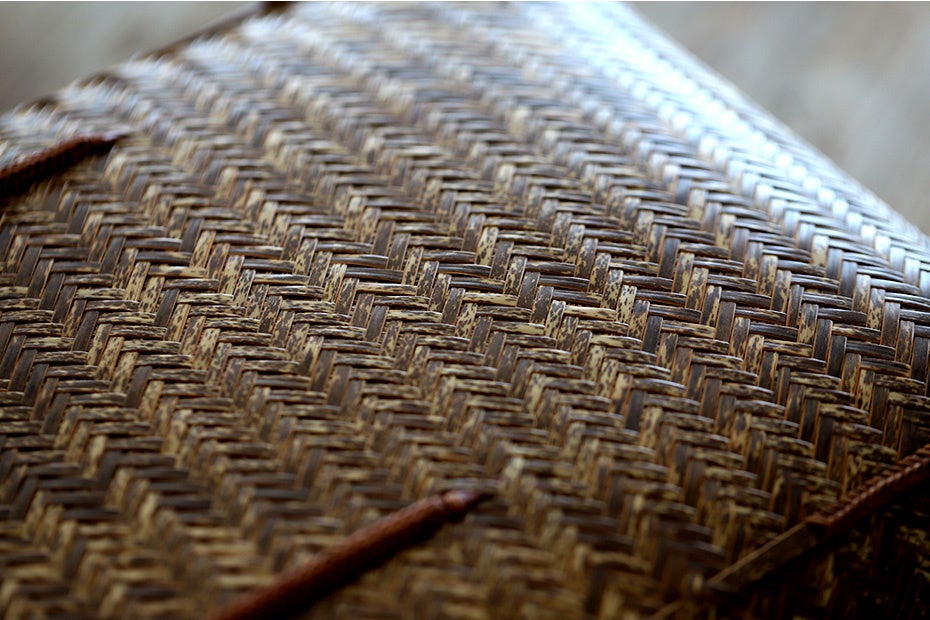 本製品に用いられている虎斑竹の表面に浮かぶ虎模様は自然が数年かけて描き出す芸術であり、その色や形は一本ごとに異なります。まさに唯一無二の素材を、熟練の職人が一本一本丁寧に割り、厚みや幅を均一に整えた上で、古来から伝わる網代編みの技で形作っています。網代編みは規則正しい美しい模様を生み出す一方、強度としなやかさを兼ね備えるため、高い技術力と時間を要する手仕事です。