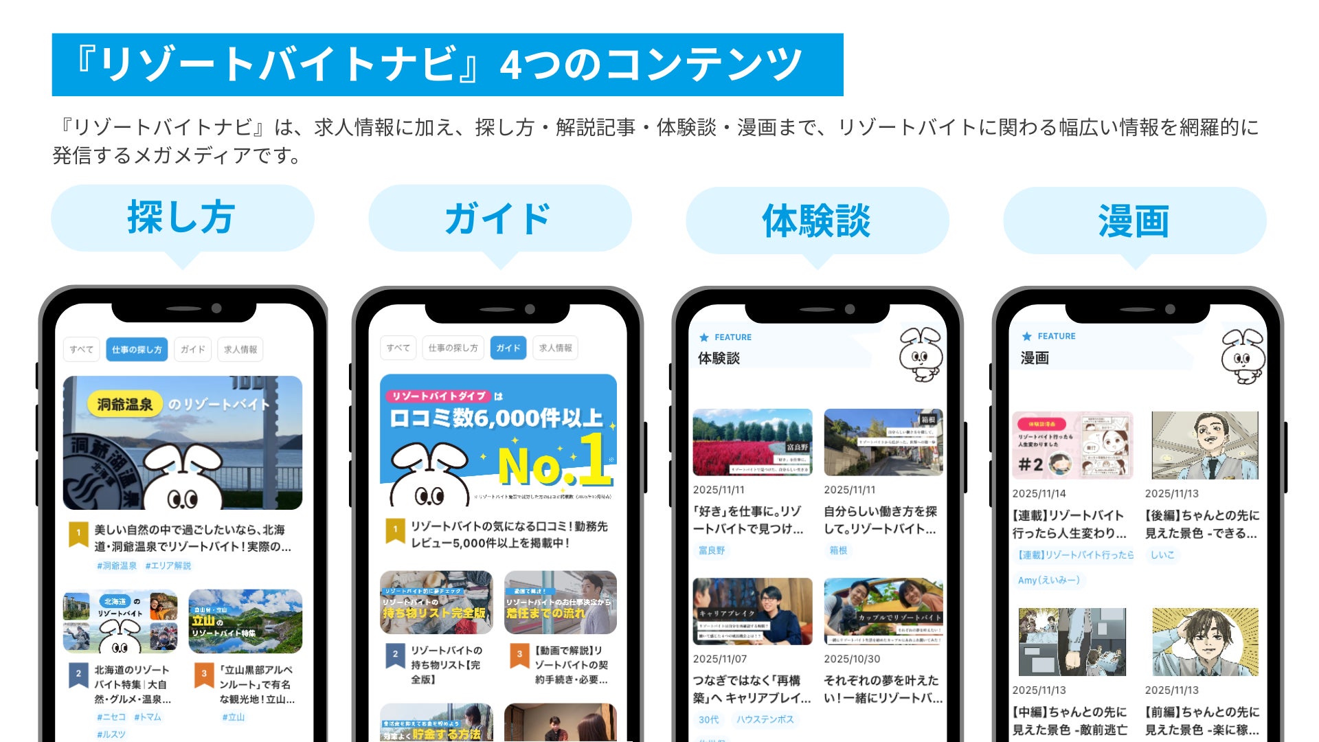 「旅して働く」をコンセプトに、求人情報に加えて、探し方・解説記事・体験談・漫画まで、リゾートバイトに関わる幅広い情報を網羅的に発信するワンストップ型のメディアとして展開しています。
