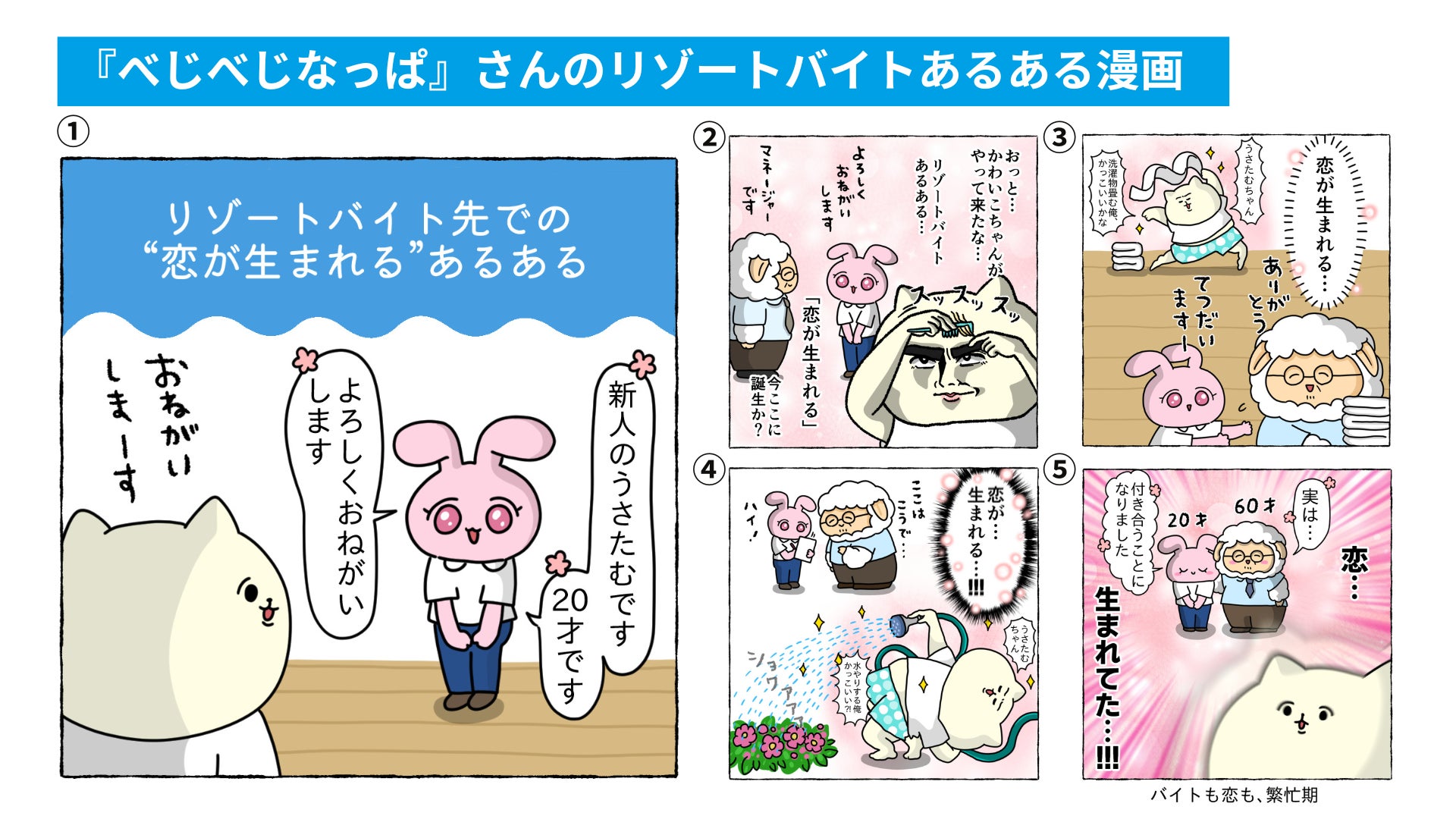 『リゾートバイトナビ』のコンテンツの一つである「漫画でわかる!リゾートバイト」特集では、「べじべじなっぱ」さんをはじめとした、複数の人気漫画家さんがリゾートバイトにまつわる漫画を連載中!