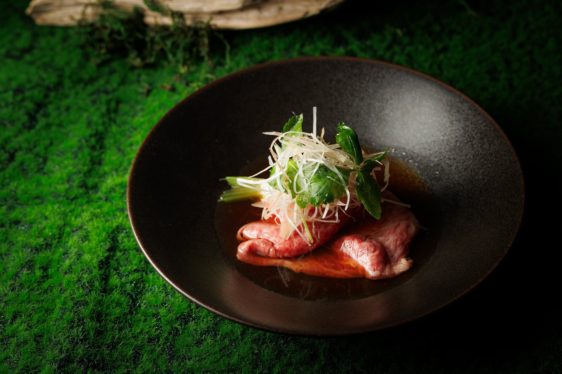 かつお出汁とコンソメを使い和と洋を融合させたスープに、絶妙な火加減で仕上げた和牛ロース肉を添えたまさにジャンルレスなフレンチを提供するLA VIE 1923ならではのメニューです。