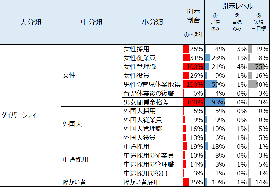 <指標毎の開示割合、開示レベル(ダイバーシティ)>