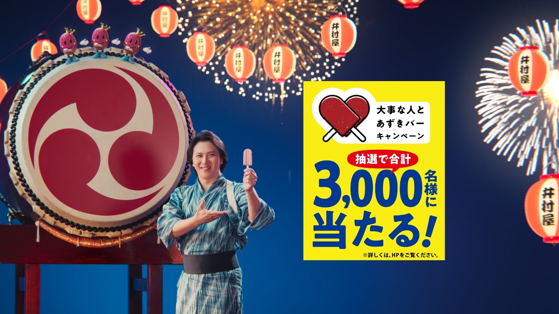 当社のイメージキャラクターをつとめて2025年で10年目となる尾上松也さんが、井村屋のキャラクター「アズキキング」とあずきバー音頭のリズムに合わせて和太鼓をたたき、『あずきバー』のおいしさを楽しく紹介するストーリーです。