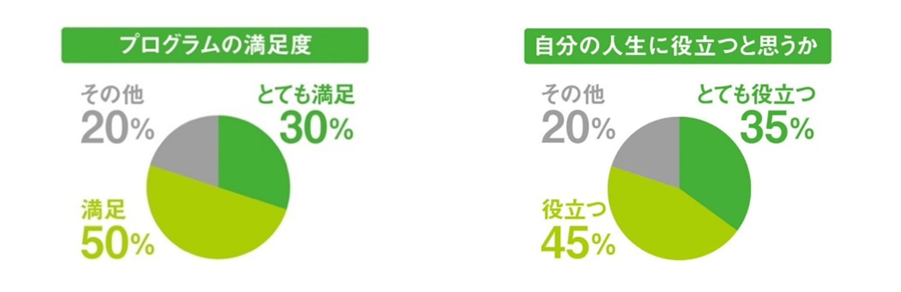 実施後の参加生徒へのアンケート調査では、「自分の人生に役立つと思った割合:80%」「プログラム全体への満足度:80%」と、非常に良い評価が得られました。