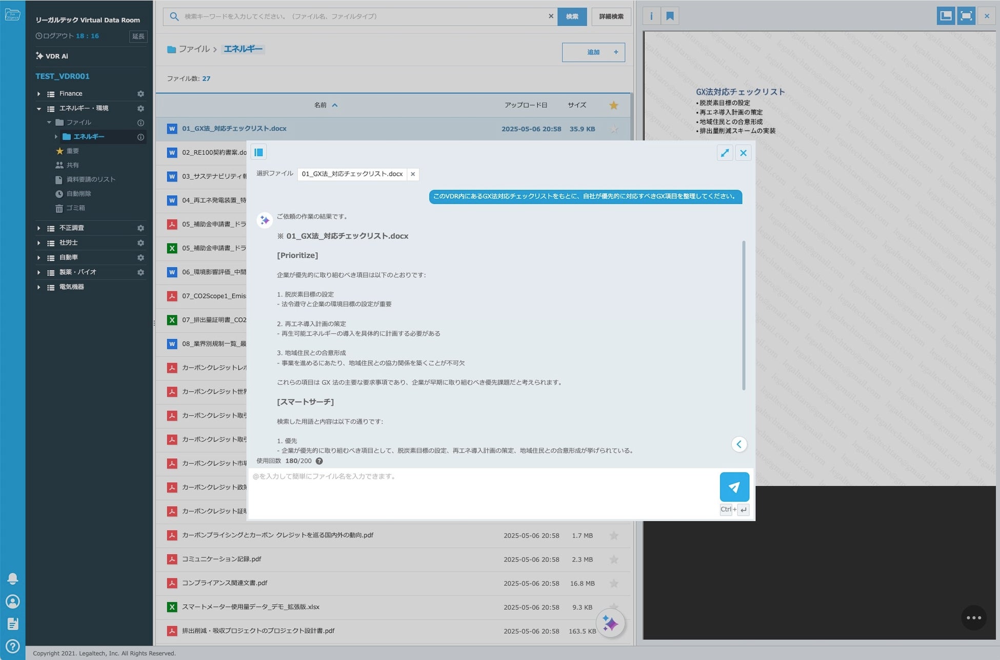 2025年5月8日 リーガルテック株式会社(本社:東京都、代表取締役:佐々木 隆仁)は、セキュアな文書共有・管理を実現するバーチャルデータルーム(VDR)「リーガルテックVDR」に、当社独自開発の生成AI「AI孔明」を統合し、エネルギー・環境業界向けの新機能をリリースいたしました。