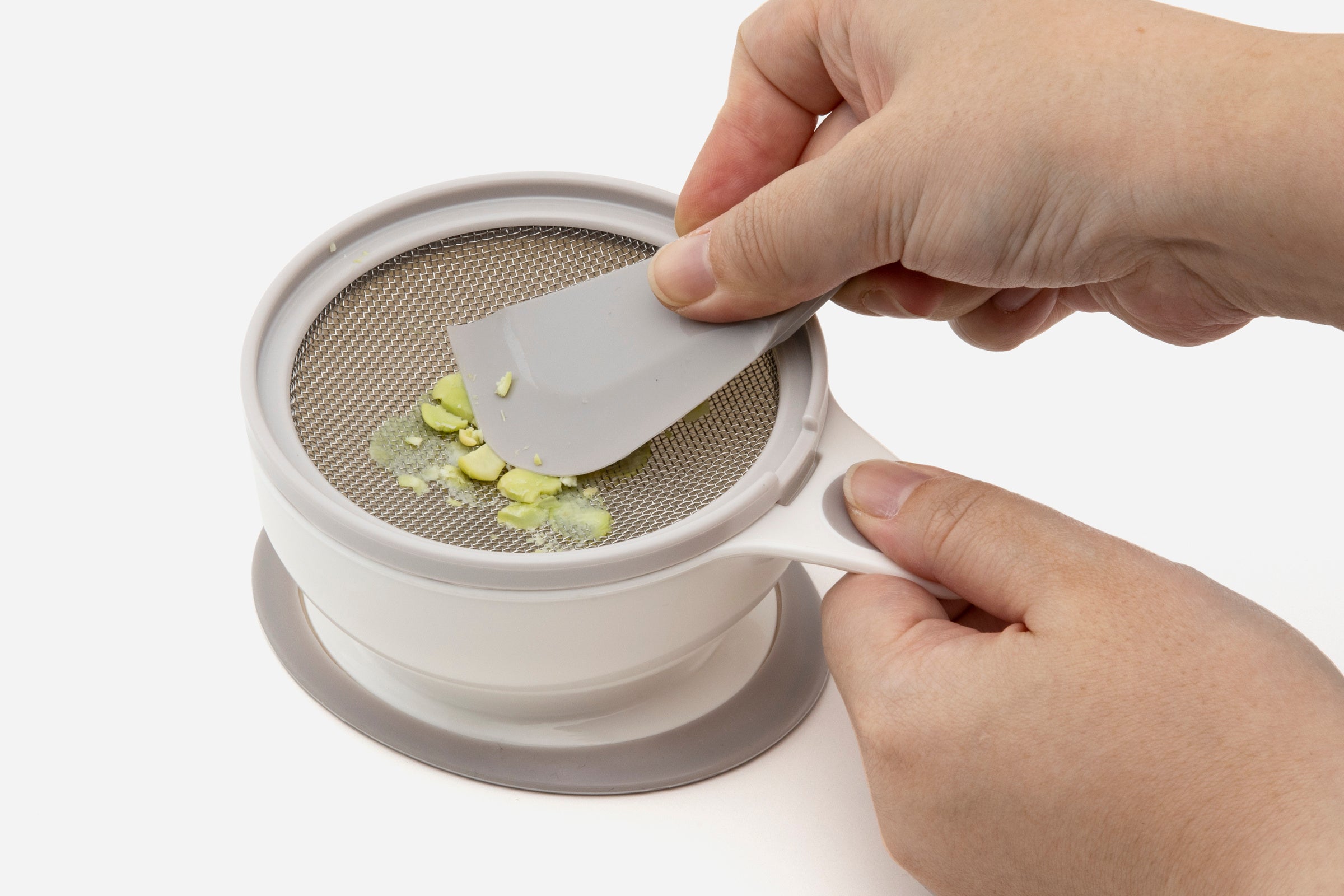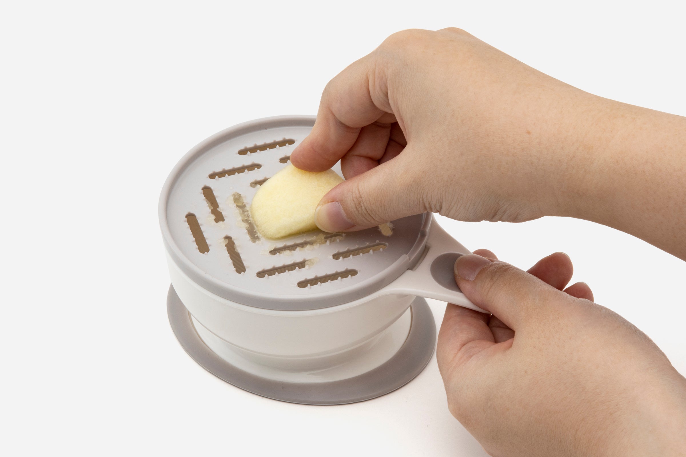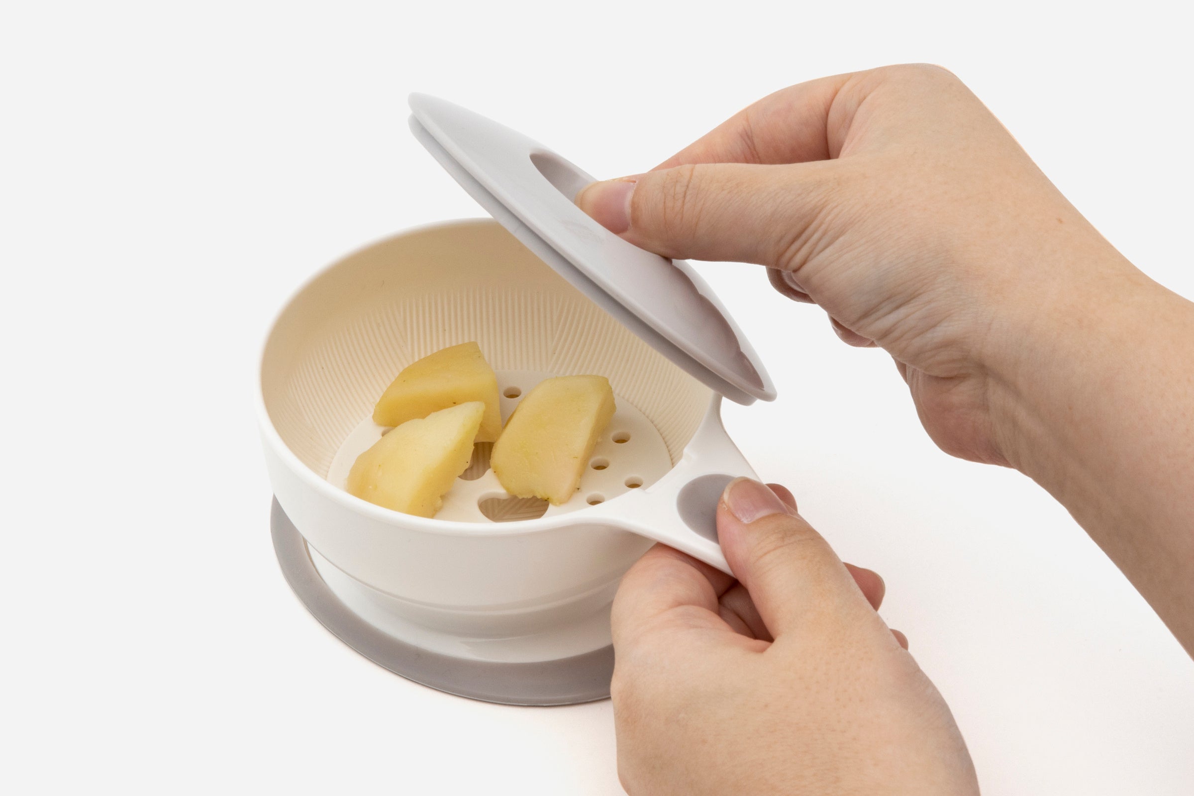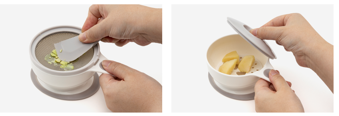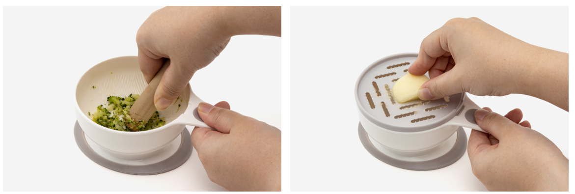 「離乳食調理器9点セット」は、子育て世代が悩みがちな離乳食期に嬉しいアイテムがそろったセットです。「すりつぶす・おろす・うらごし・電子レンジで蒸す」という離乳食づくりに必要な4つの基本調理ができます。通常の調理器具では量の調整が難しかったり、洗い物が大変という“子育てあるある”な悩みを解決する、コンパクトサイズながら頼れるアイテムです。調理器具のセレクトは自社でしており、多くの子育て家庭から望まれていた、食材を細かくするのに欠かせない「すりこぎ」もついています。また、べビーアイテムでありながらKEYUCAならではの暮らしになじむホワイト&グレーのニュアンスカラーもポイントです。
