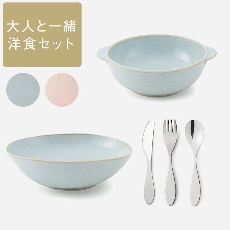 食事の時間が楽しくなってくる5~6歳頃の子どもは、食器なども大人と同じのを使いたくなるもの。ハンバーグやサラダなど洋食を食べるときに便利な、国産でそろえたセットです。新潟県・燕三条でつくられた、子どもでも持ちやすいシンプルなデザインのカトラリー3点と、大人が使う食器と同じ見た目の楕円皿、小鉢を組み合わせました。
