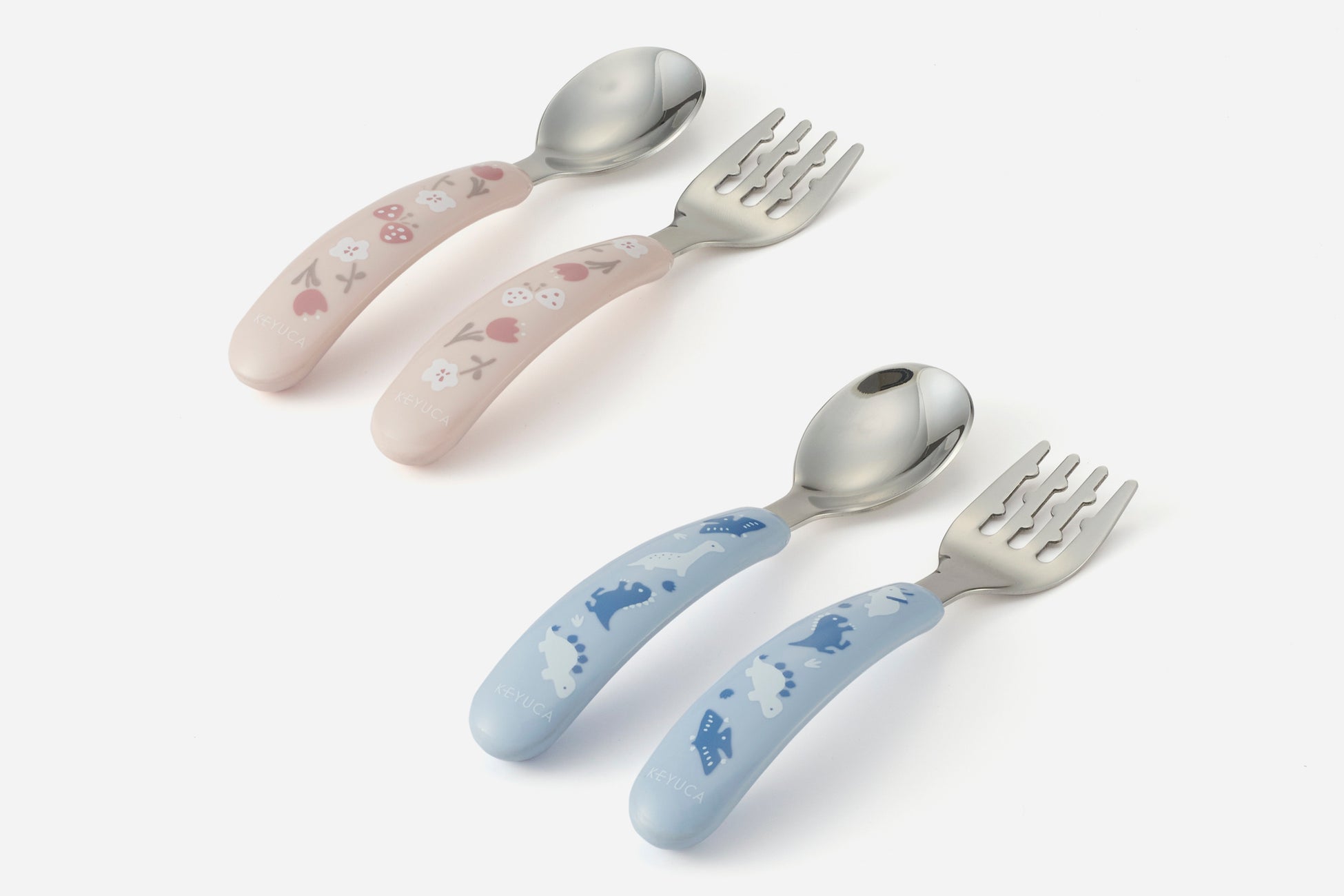 はじめてスプーンやフォークを使う年頃におすすめな、握って持ちやすい形状のスプーンとフォークのセットです。太めでカーブしたプラスチック製の握りやすいグリップは、可愛いお花や恐竜のモチーフ入り。