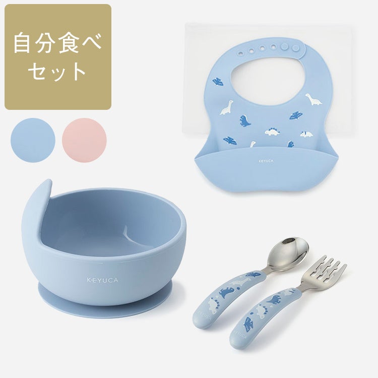 はじめて自分で食べさせ始める時期は、子どもも親もうまくいかなくてイライラすることも。そんな方におすすめのセットが登場します。子どもが「自分でできた!」と自信がつきやすくなる、吸盤付きで倒れにくく、すくいやすいボウル、食べやすい工夫が詰まったスプーンとフォーク、食べ物をこぼしても洗って拭いてすぐまた使えるシリコンビブを組み合わせました。汚れてもお手入れしやすいものばかりなので、子どもの成長が感じられる食事の時間が笑顔いっぱいで楽しめます。