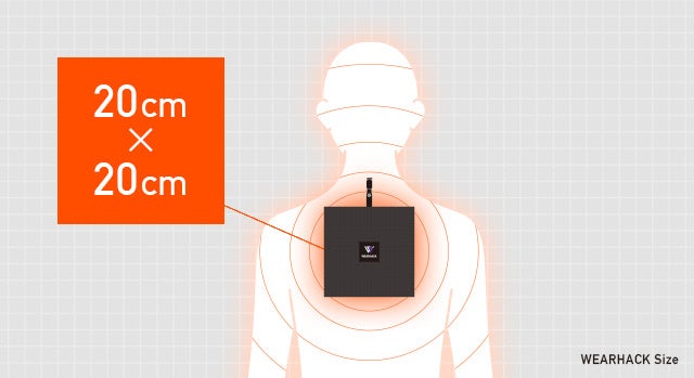 WEARHACKは電源を入れると内蔵の電熱線がすぐに熱を放出。リモコンの電源をONにして10秒後にはじんわり温まり、取り付け箇所から暖かさが広がります。背中の肩甲骨周りを覆うように設計しているので、取り付けた場所から暖かさが広がります。