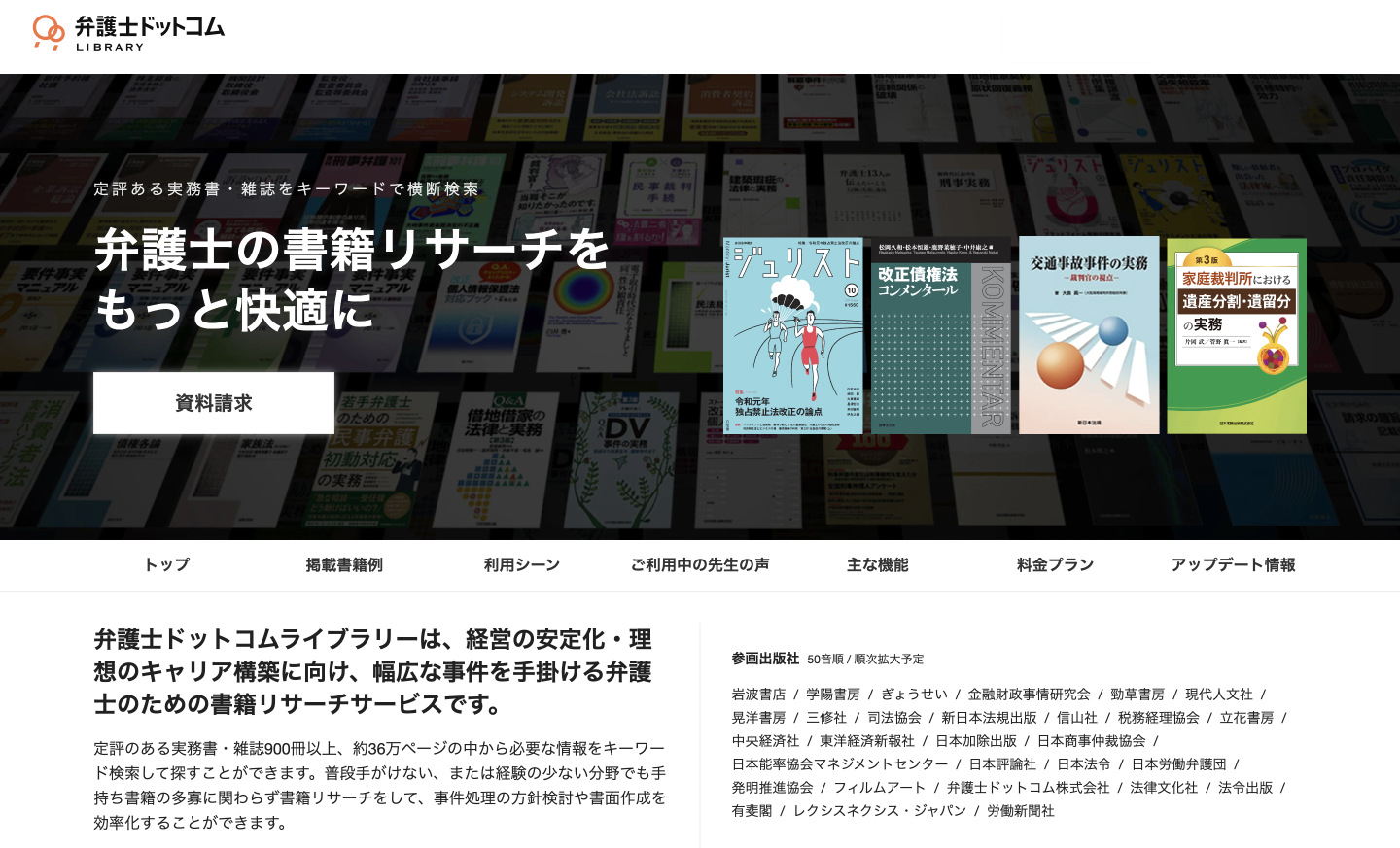 弁護士ドットコムLIBRARYは、28社1400冊以上の書籍をキーワードで検索・閲覧することができるオンライン法律書籍サービスです。紙の書籍の中から探す手間が省け、膨大な書籍の中からリサーチができるので、事件処理の方針検討や書面作成等の弁護士実務を効率化する事ができます。※ オリジナル書式・解説動画の利用には「弁護士ドットコムGYOSYS」のご契約が必要です。