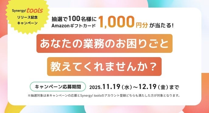 『Synergy! tools』アカウント登録+キャンペーン登録を行った方の中から、抽選で100名様に1,000円分のAmazonギフトカードをプレゼントします。