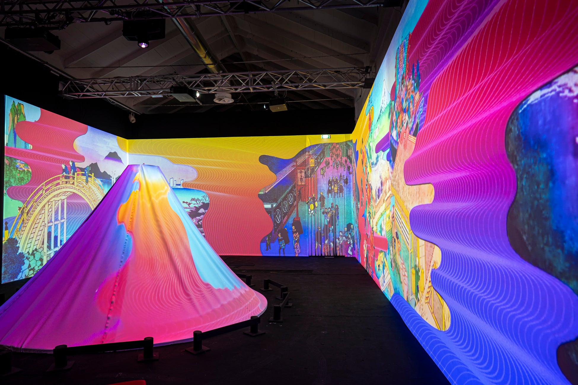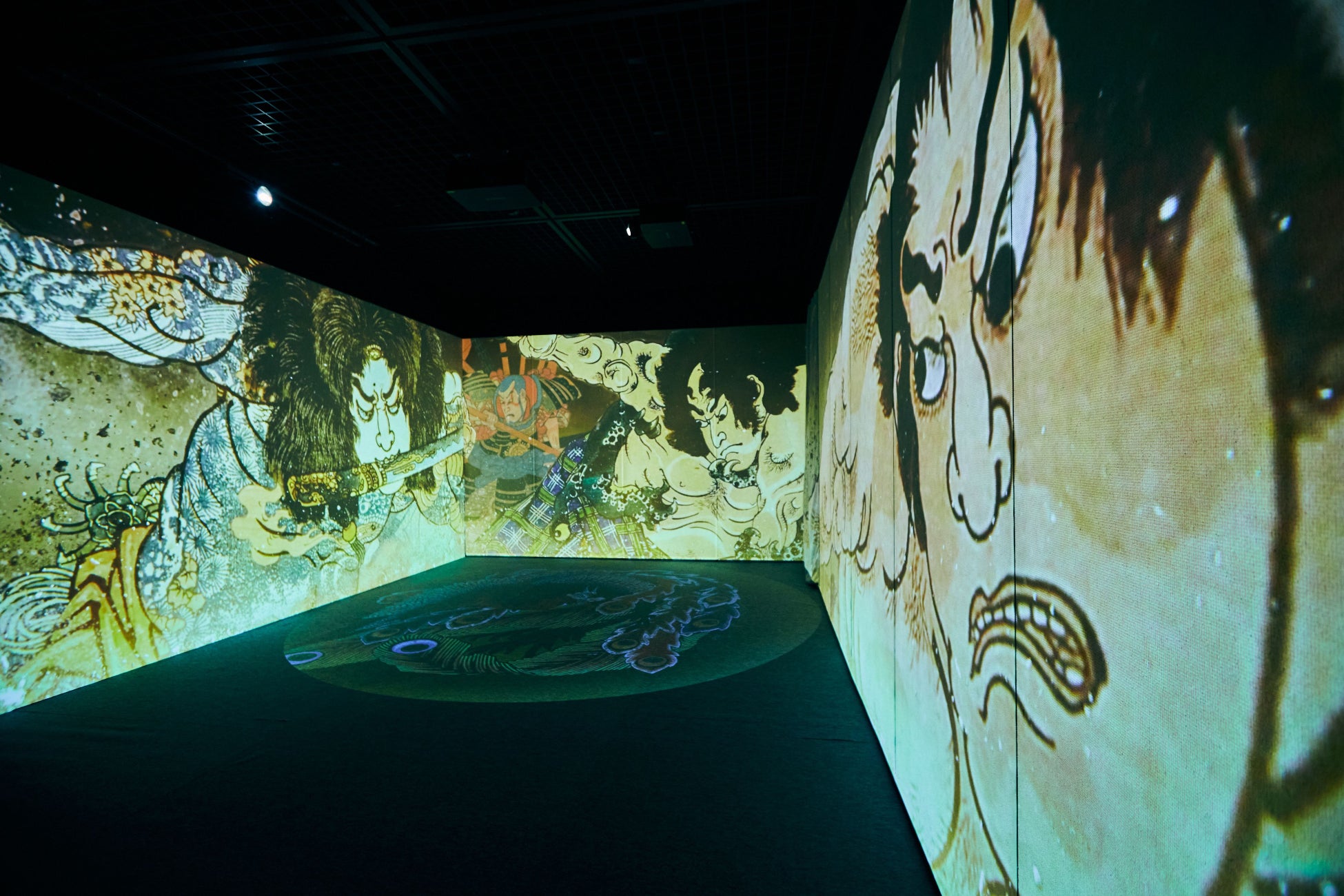 「動き出す浮世絵展」は、葛飾北斎、歌川国芳、歌川広重、喜多川歌麿、東洲斎写楽、歌川国貞など世界的な浮世絵師の作品300点以上をもとに、3DCGアニメーションやプロジェクションマッピングを駆使して大人から子どもまで楽しめるグラフィカルなデジタルアート作品として描き、約10エリアの立体映像空間で浮世絵の世界に没入できるイマーシブ体感型デジタルアートミュージアムです。