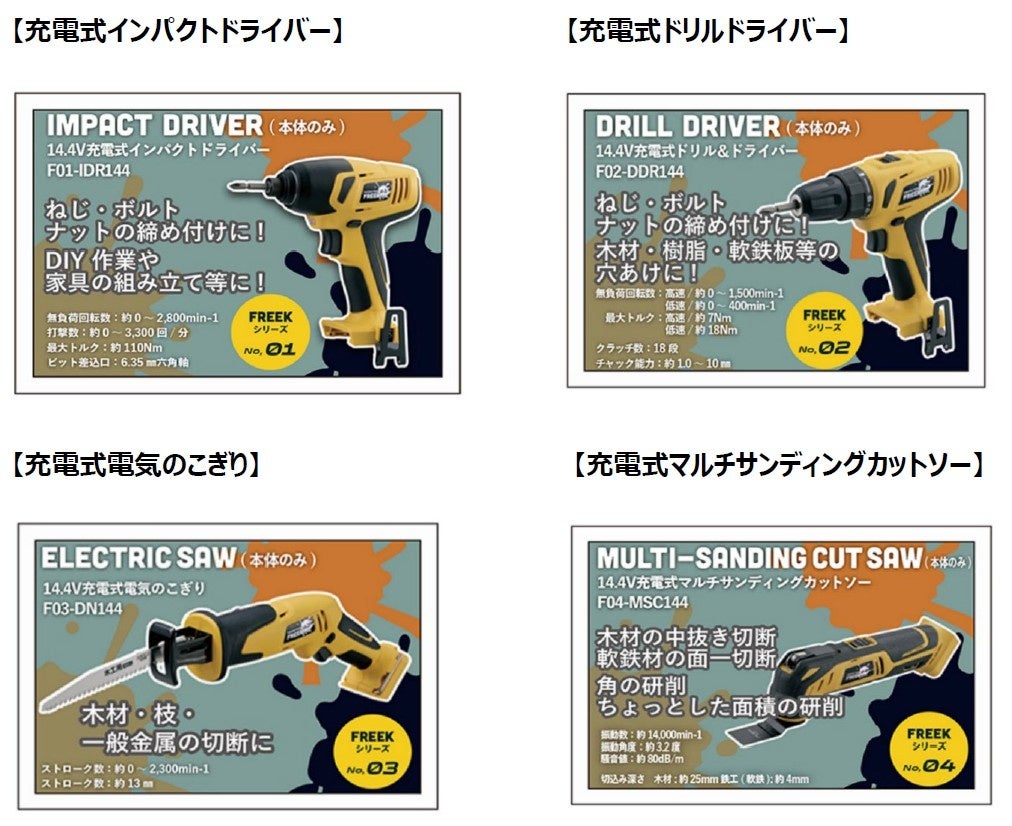 株式会社綿半ホームエイド(長野県長野市 代表取締役社長:牧島禎彦)では、バッテリーが共用可能な自社ブランドの電動工具「FREEK」の販売を開始しました。