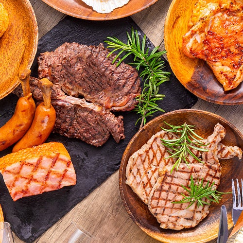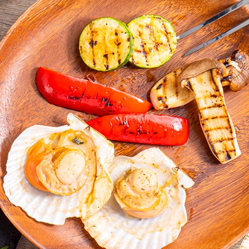 柔らかくジューシーな肉質が魅力のサーロインと、脂肪分の少ない上質な赤身のヒレを同時に楽しめるTボーンステーキを特別にご用意しました。そのほか、塩麴で下味をつけた豚肩ロースやタンドリーチキンなど5種類のお肉をはじめ、ホタテやイカなどの新鮮な海鮮、グリル野菜、自家製ピザ、デザートにはスモアを楽しめるボリューム満点のラインアップです。