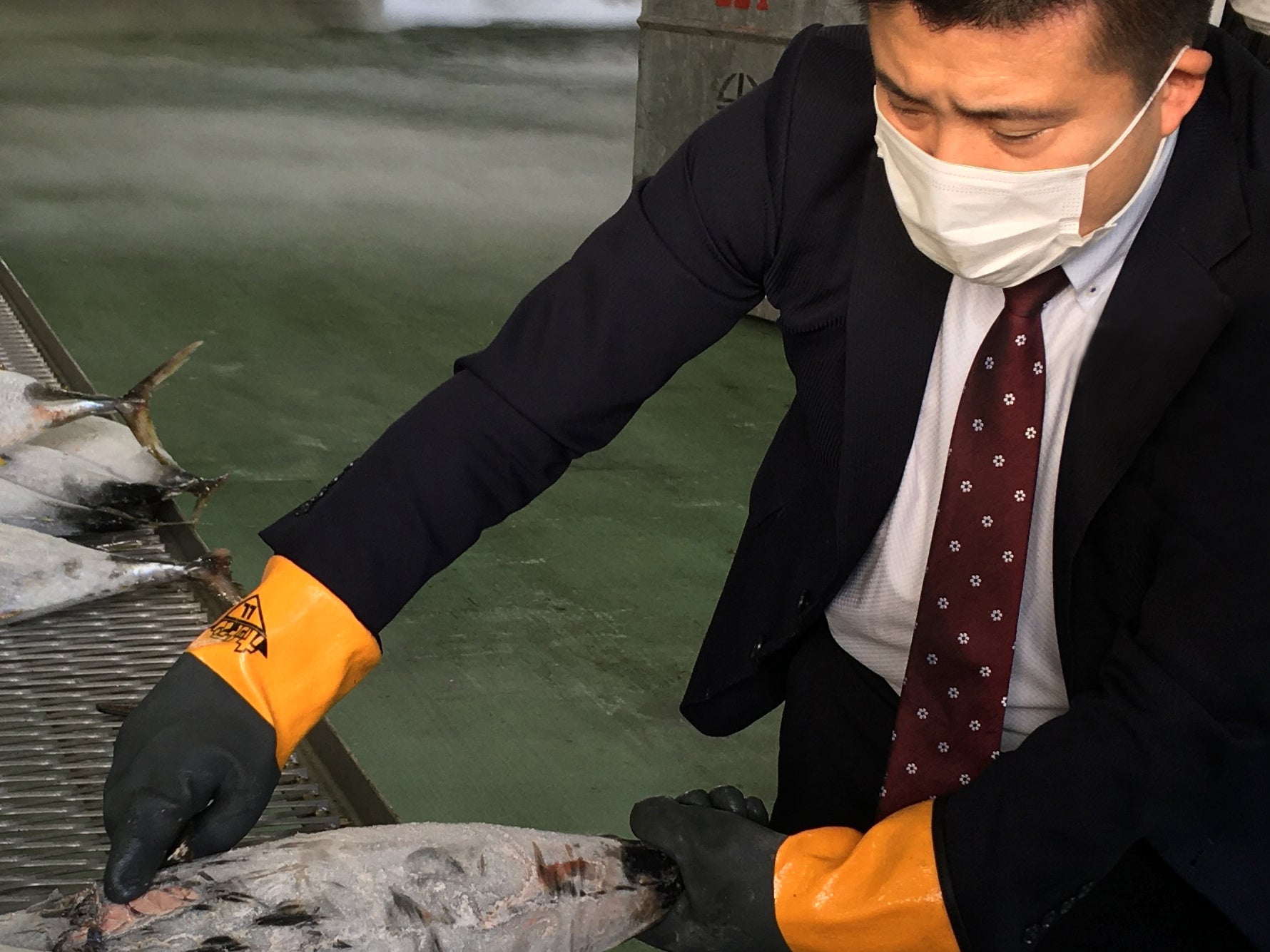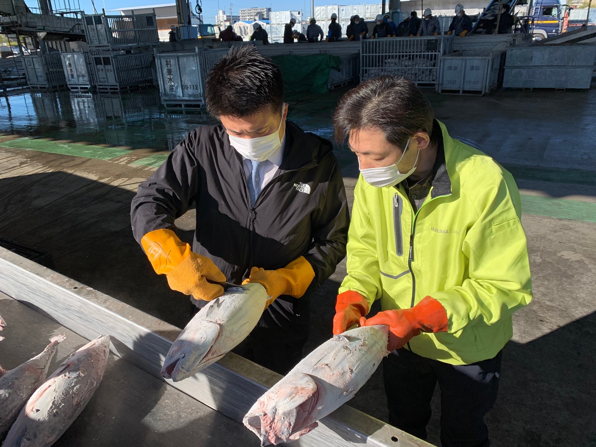 出刃と呼ばれる専用の器具で脂のりを見極める。※写真左が山上。