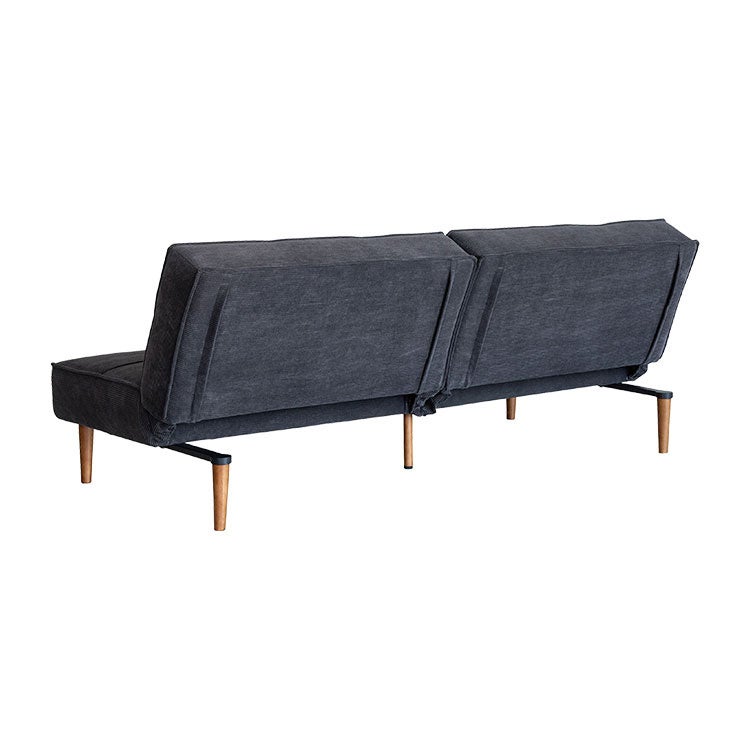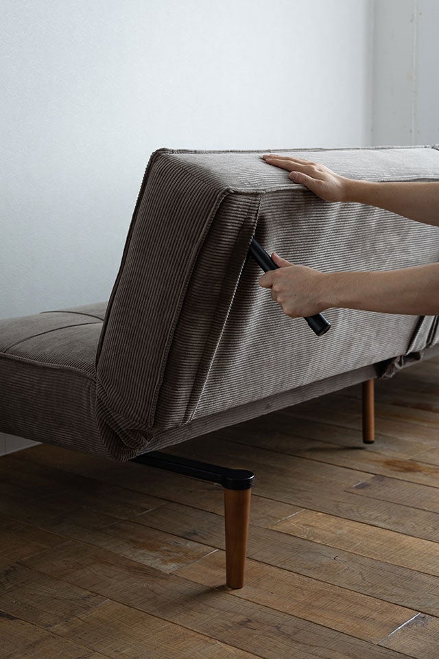 ベッドへの切り替えは、背もたれ裏に収納された専用脚を引き出し、背を倒すだけ。ソファ使用時は脚を背面内部に格納できるため、すっきりとした外観を保ちます。