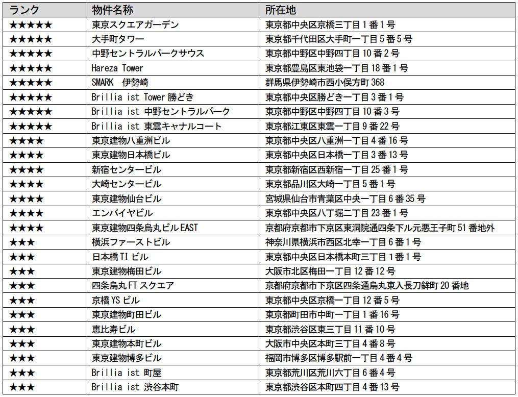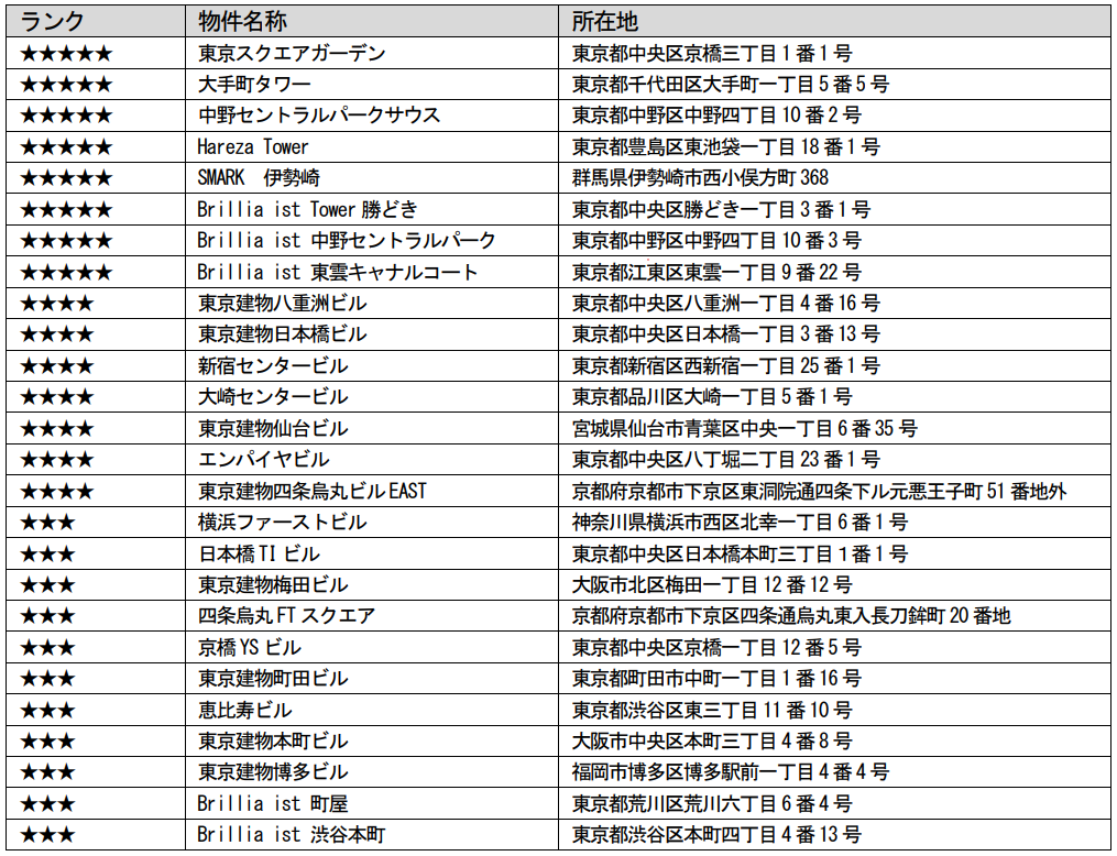 今回、レジデンスでは「Brillia ist 東雲キャナルコート」(東京都江東区、2005年竣工)が最高評価の5つ星を取得し、オフィスビルでは1970年竣工の「東京建物本町ビル」(大阪市中央区)も認証を取得しています。