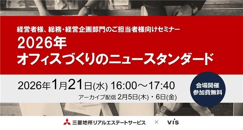 株式会社ヴィス(本社:東京都港区、代表取締役社長:金谷智浩、以下ヴィス)は、三菱地所リアルエステートサービス株式会社(本社:東京都千代田区、代表取締役社長:清水秀一)と共同で、未来の働き方に直結するオフィス戦略をテーマとしたセミナー「2026年オフィスづくりのスタンダード」を開催いたします。 本セミナーでは、両社の専門家が最新のオフィストレンドを踏まえ、2026年を見据えたデザイン戦略、オフィスマーケットの展望、そして移転検討における重要な判断ポイントをわかりやすく解説します。