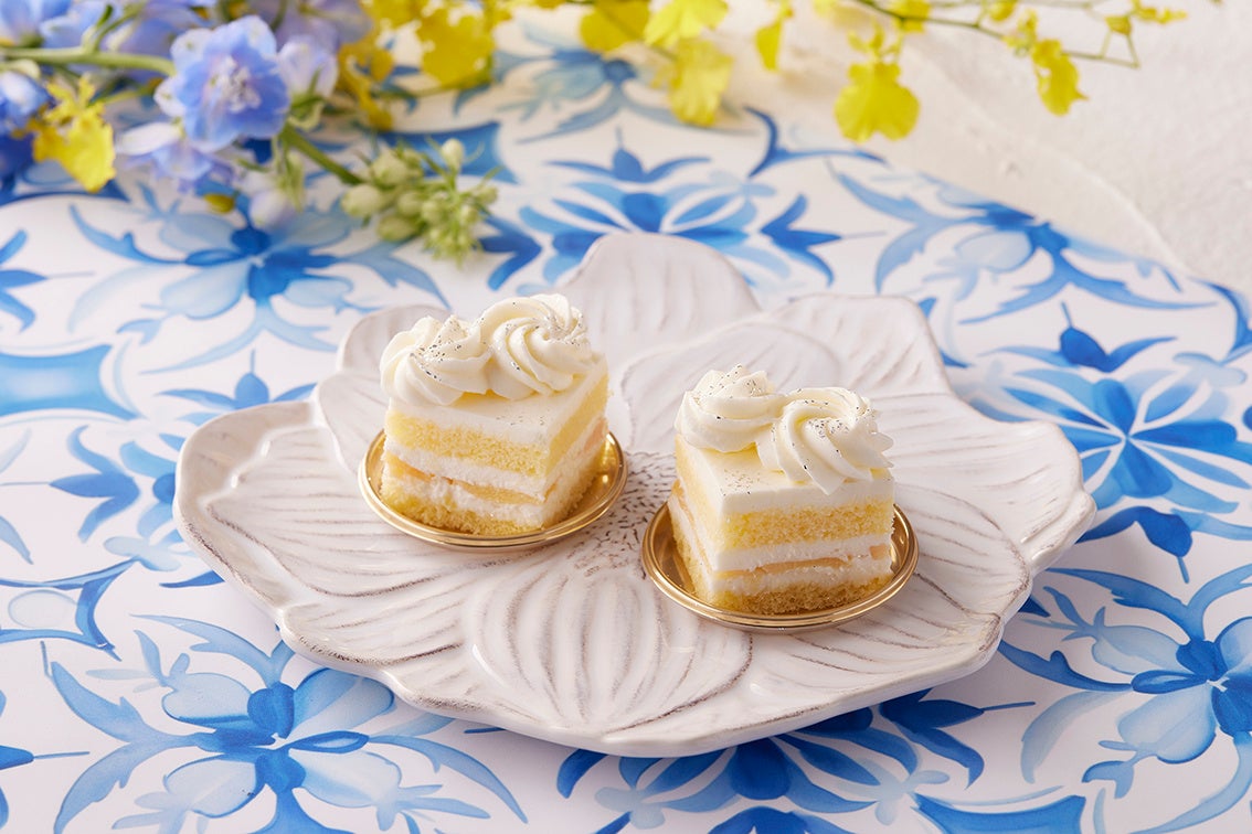 白い薔薇をイメージした洋梨のショートケーキ、カモミールに見立てたレモンのタルト、パイナップル香るマカロン。JJモデルの感性が花咲く、優美なスイーツ。
