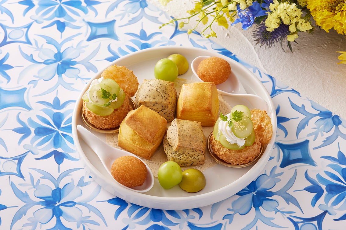 シャインマスカットのシュークリームと紅茶香るスコーン、ライムグリーンのチョコレートやイタリアンフリット。甘さと塩気が心地よく交差する、遊び心あるひと皿。