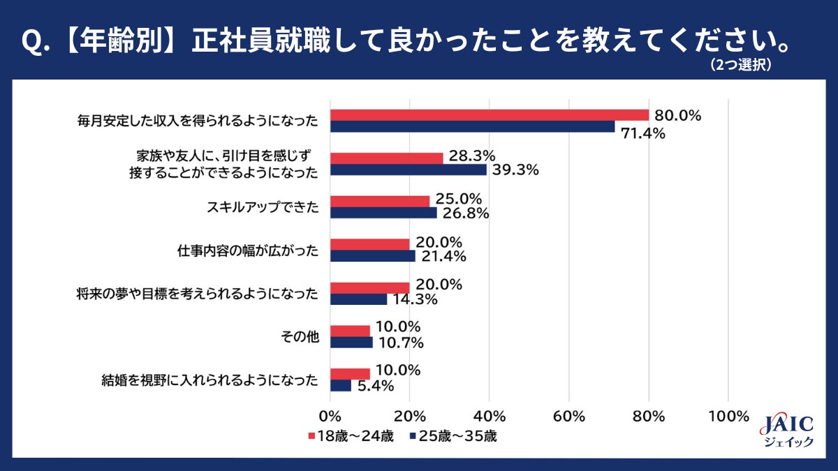 年齢別では、18~24歳、25~35歳ともに1位「毎月安定した収入を得られるようになった」となりました。全体的な傾向に大きな差異はありませんが、2位「家族や友人に、引け目を感じず接することができるようになった」については、18~24歳に比べ、25~35歳のほうが11ポイント高い結果となりました。