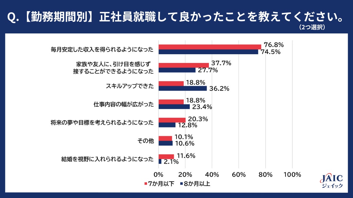 勤務期間別では、「7か月以下」「8か月以上」ともに「毎月安定した収入を得られるようになった」が最多となりましたが、7か月以下の2位は「家族や友人に、引け目を感じず接することができるようになった」(37.7%)、8か月以上では「スキルアップできた」(36.2%)となり、勤務期間が長いほど、自己の成長を実感する人が増加する傾向が見られました。