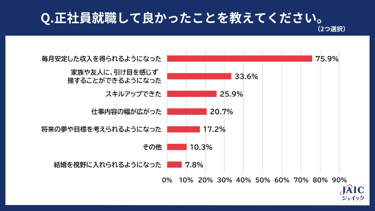 「非正規雇用から正社員就職して良かったこととして、特にあてはまるものを2つ選択してください」と質問したところ、1位「毎月安定した収入を得られるようになった」(75.9%)、2位「家族や友人に、引け目を感じず接することができるようになった」(33.6%)、3位「スキルアップできた」(25.9%)、4位「仕事内容の幅が広がった」(20.7%)、5位「将来の夢や目標を考えられるようになった」(17.2%)となりました。最下位は「結婚を視野に入れられるようになった」(7.8%)となり、非正規雇用から正規雇用への転換によって、安定収入が得られることをプラスに捉える人が多い一方、結婚が視野に入る方は多くないことが分かりました。